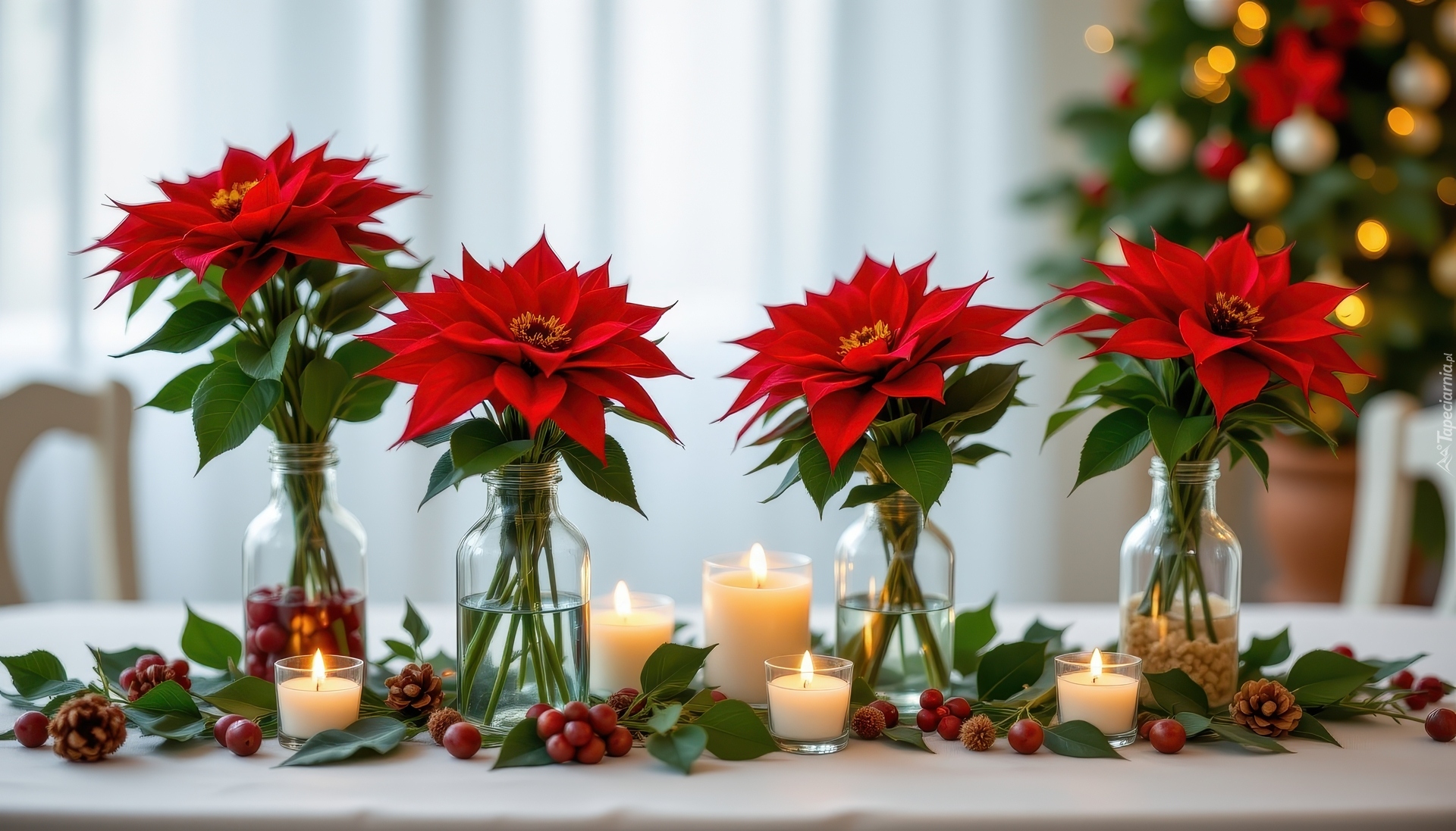 Edytor tapety: Zapalone świece obok kwiatów gwiazdy betlejemskiej w butelkach