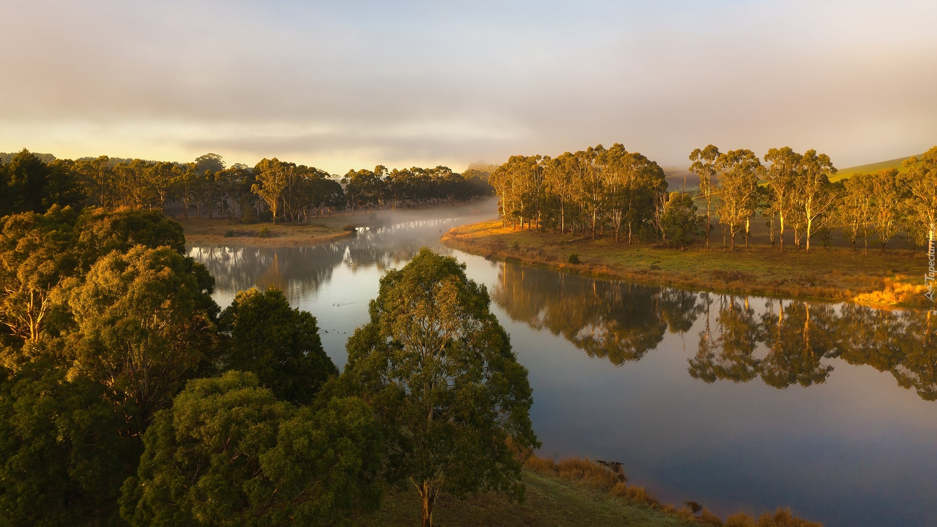 Edytor tapety: Zielone drzewa nad zamgloną rzeką o poranku