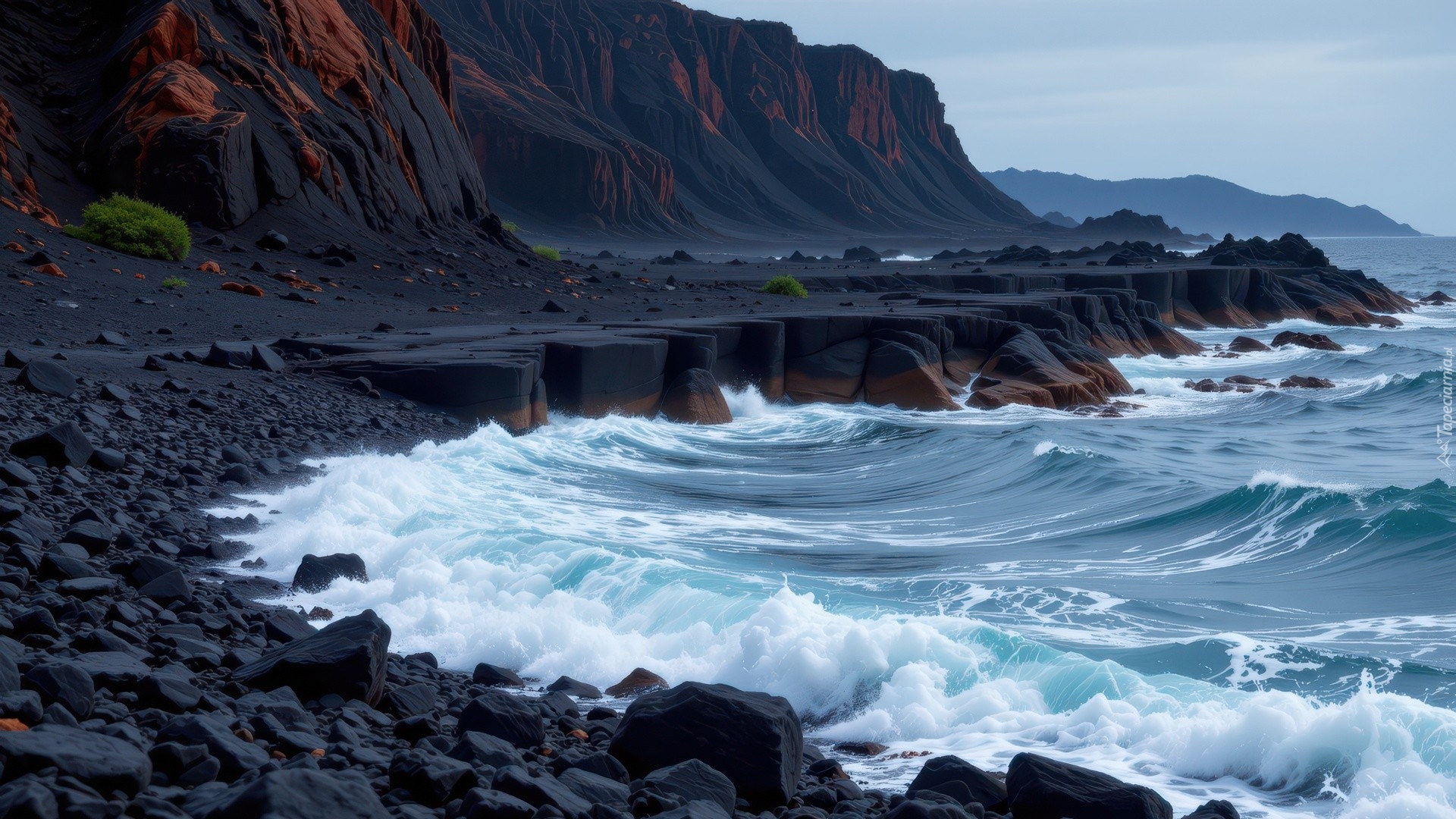 Edytor tapety: Ciemne skały i góry nad morzem
