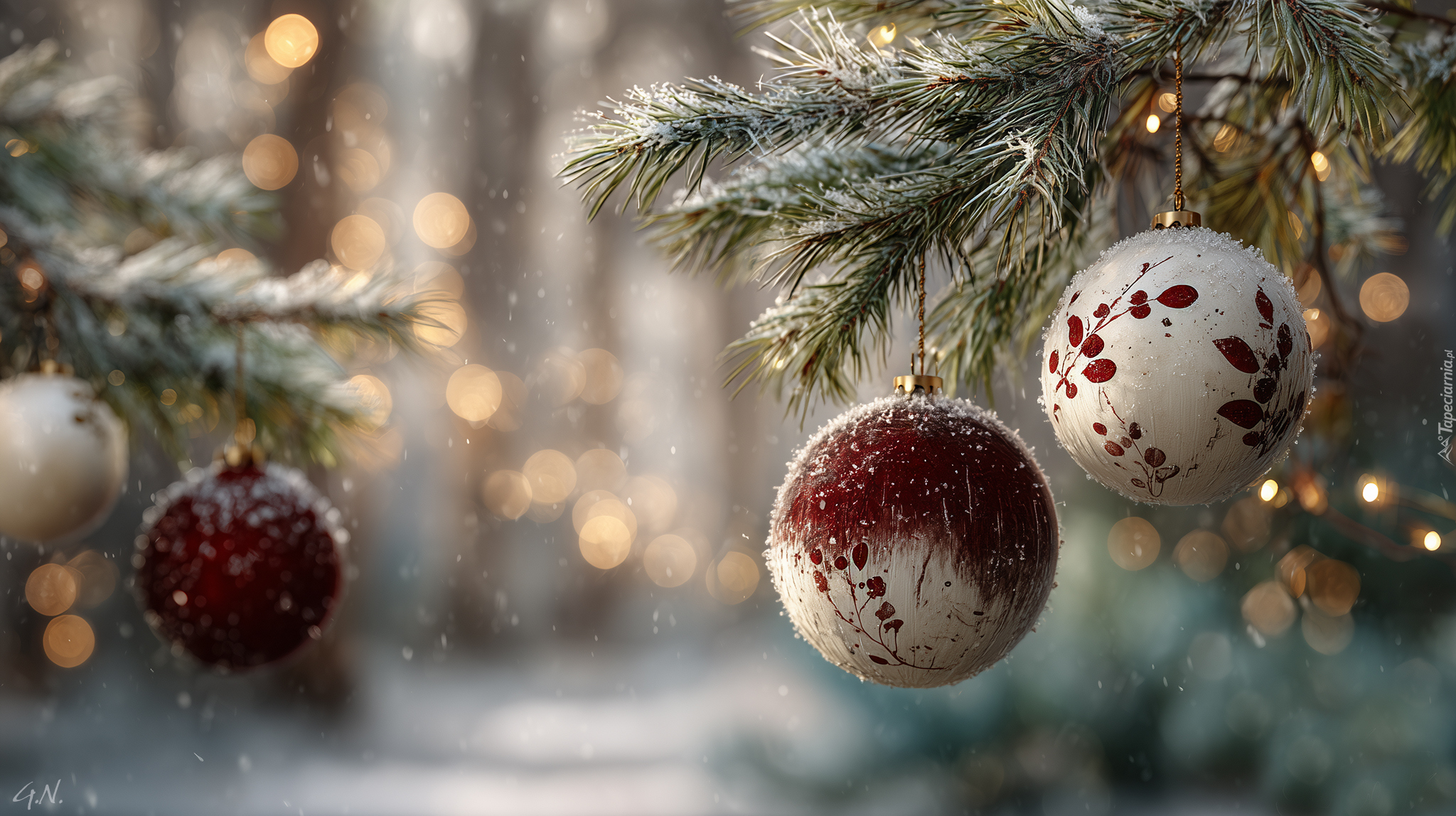 Edytor tapety: Bombki zawieszone na gałązkach świerkowych