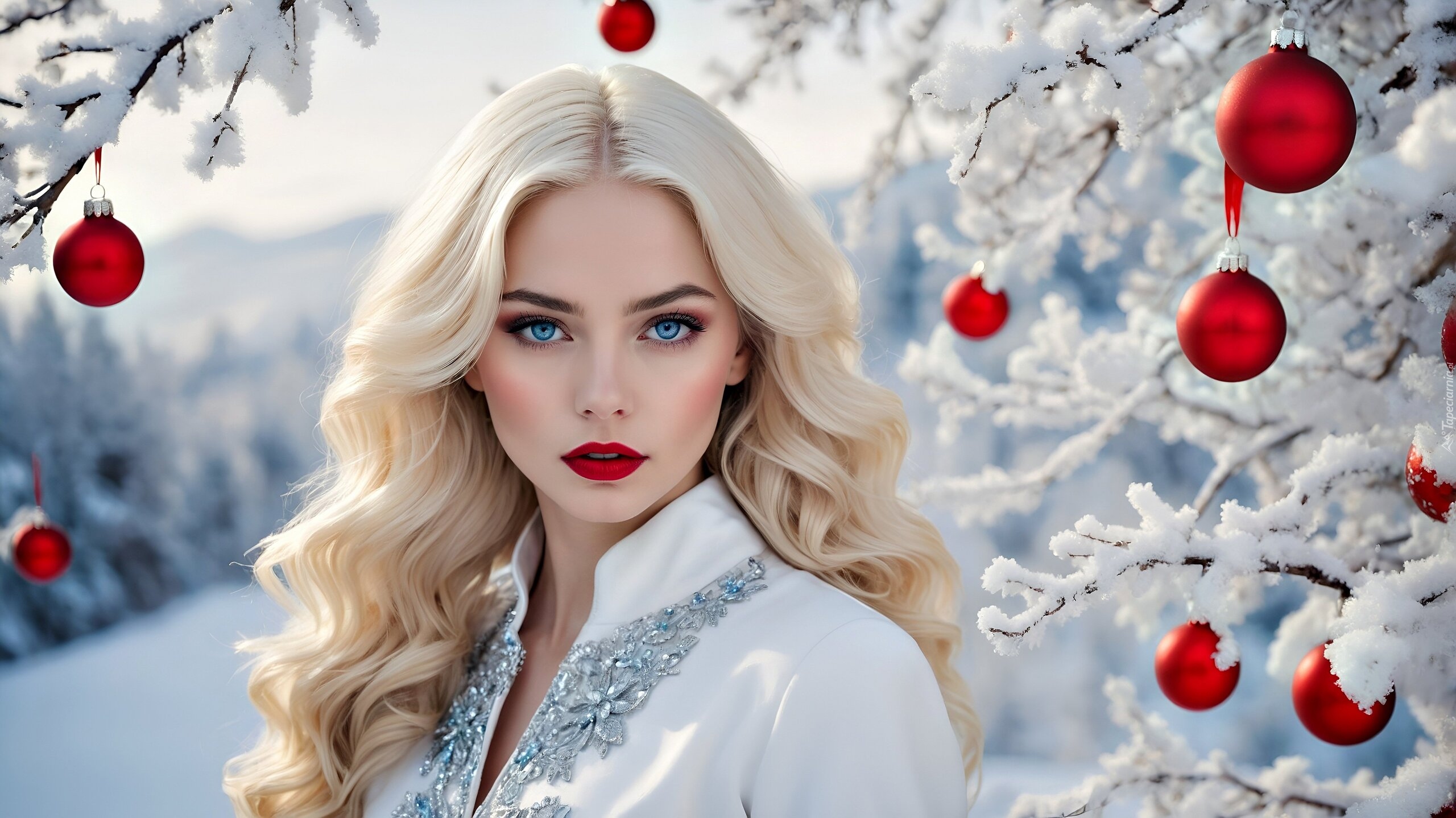Edytor tapety: Długowłosa blondynka obok czerwonych bombek na ośnieżonych gałązkach