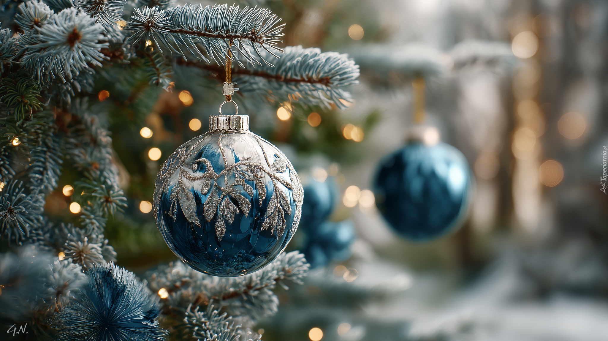 Edytor tapety: Niebieska bombka z wzorami na gałązce świerkowej