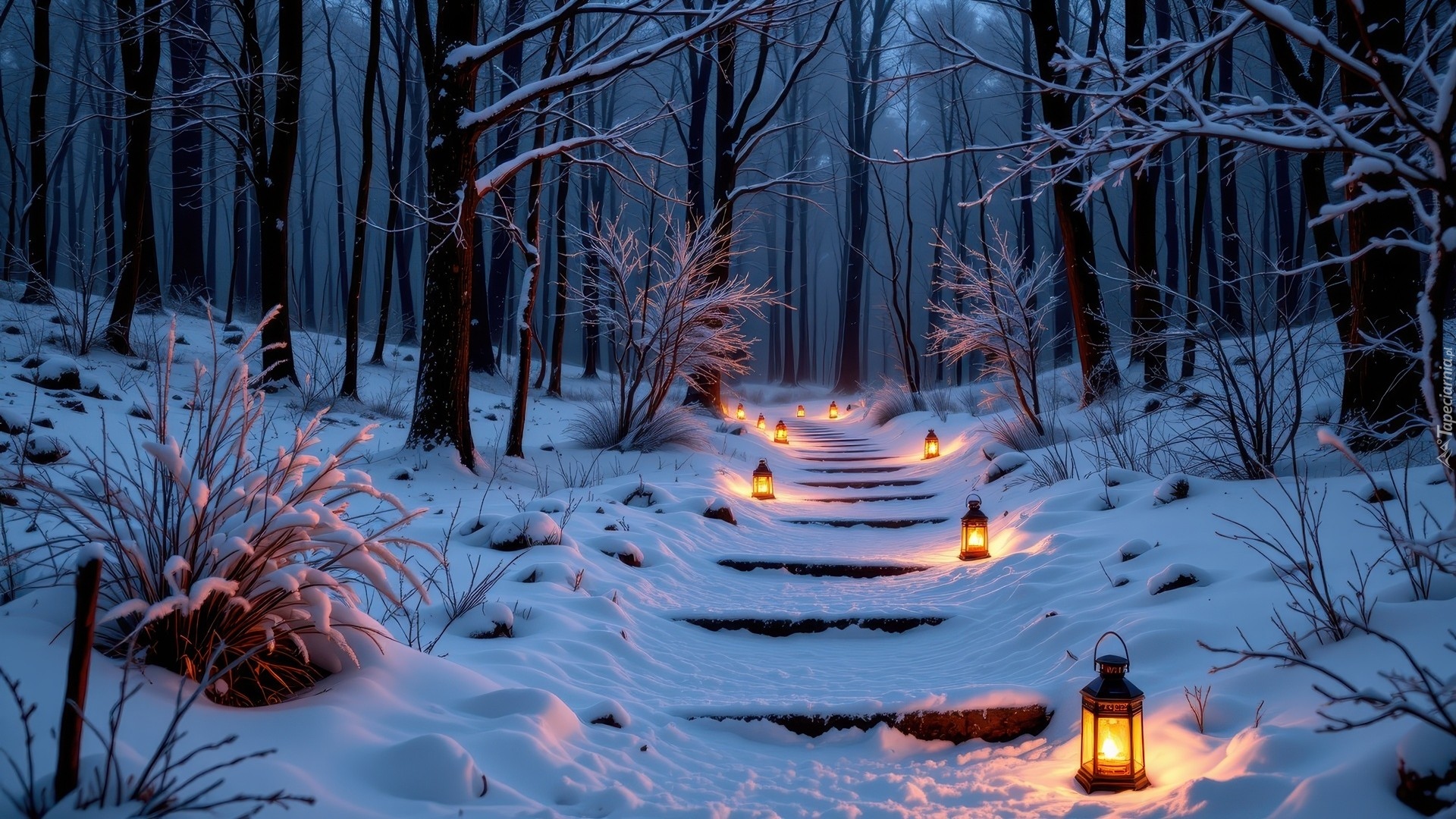 Edytor tapety: Zapalone lampiony na zaśnieżonych schodach w zimowym lesie