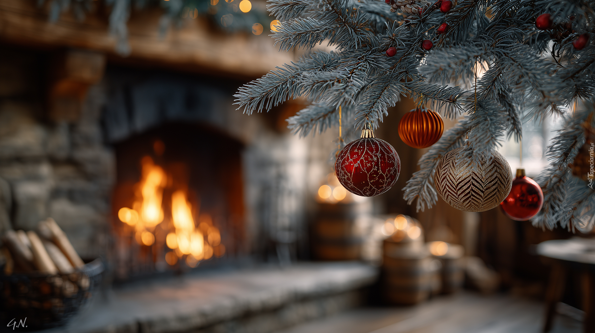 Edytor tapety: Kolorowe bombki na gałązkach choinki obok kominka