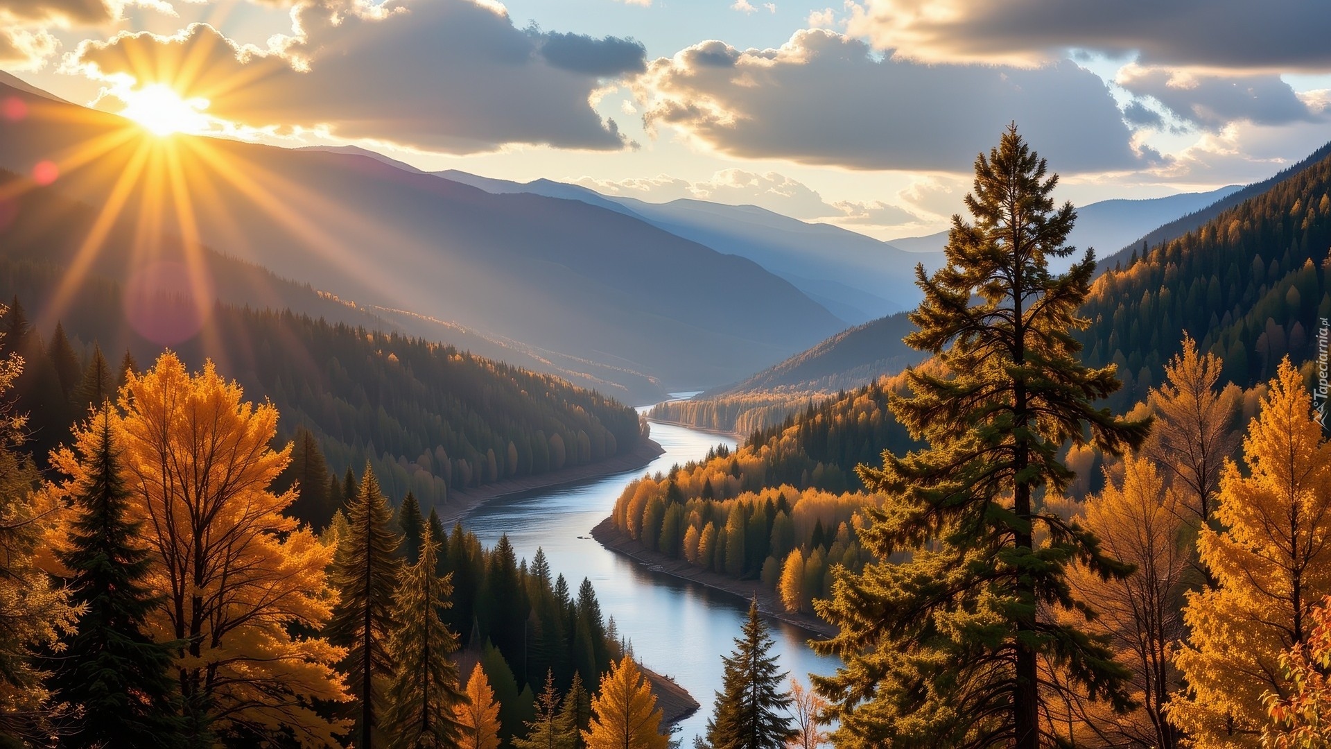 Edytor tapety: Widok na jesienne drzewa i górską rzekę