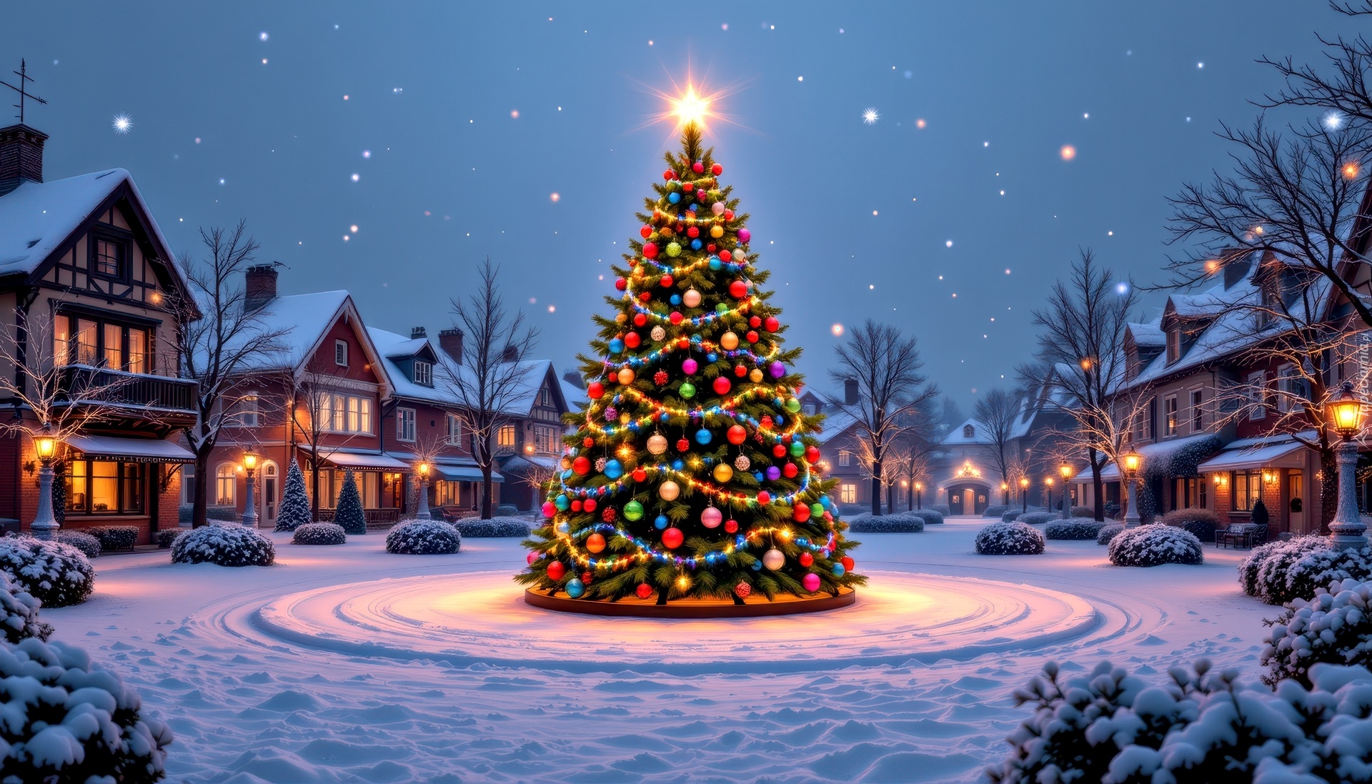 Edytor tapety: Udekorowana choinka na placu i oświetlone nocą domy