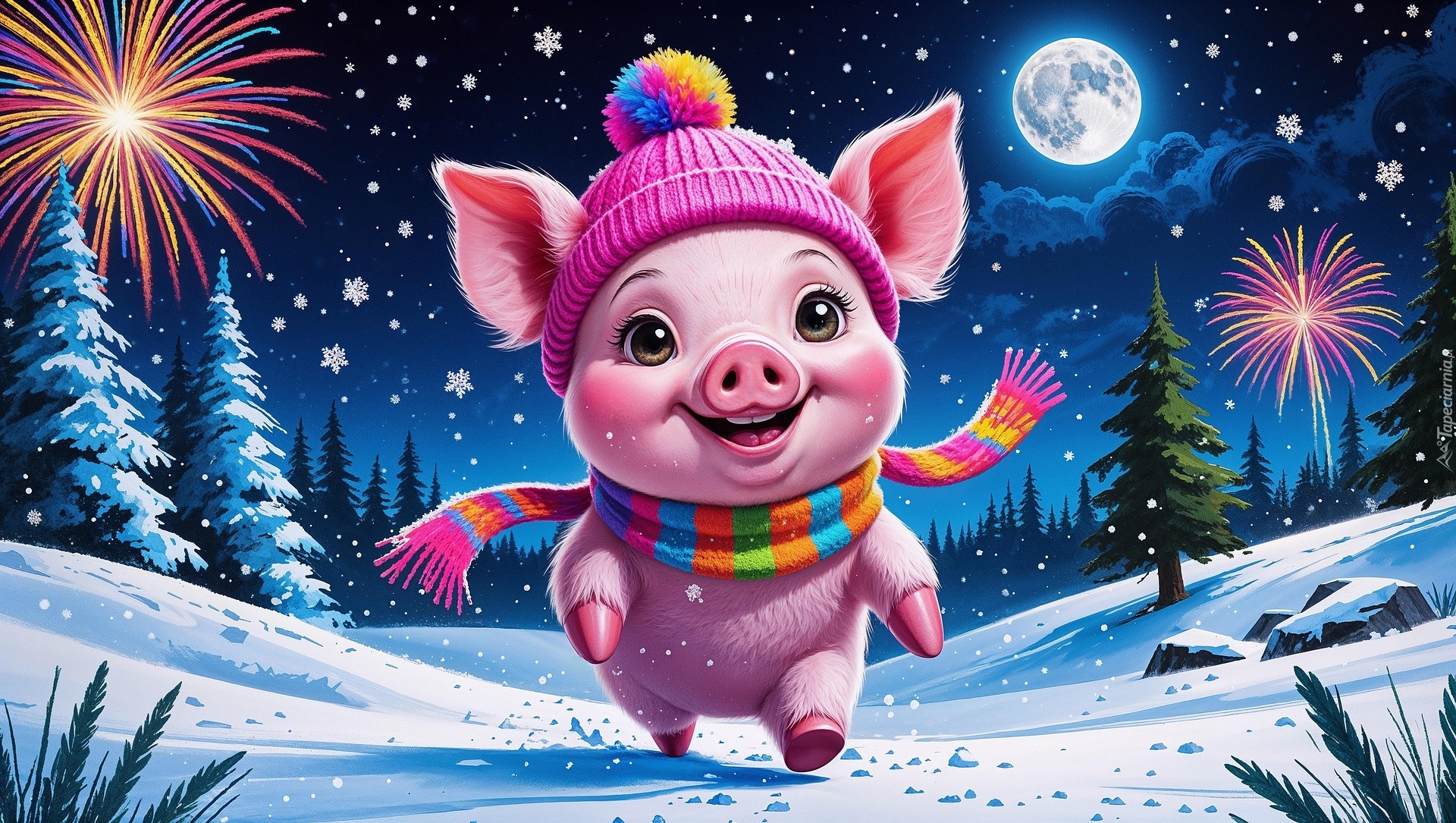 Edytor tapety: Świnka w czapce i szaliku na tle fajerwerków