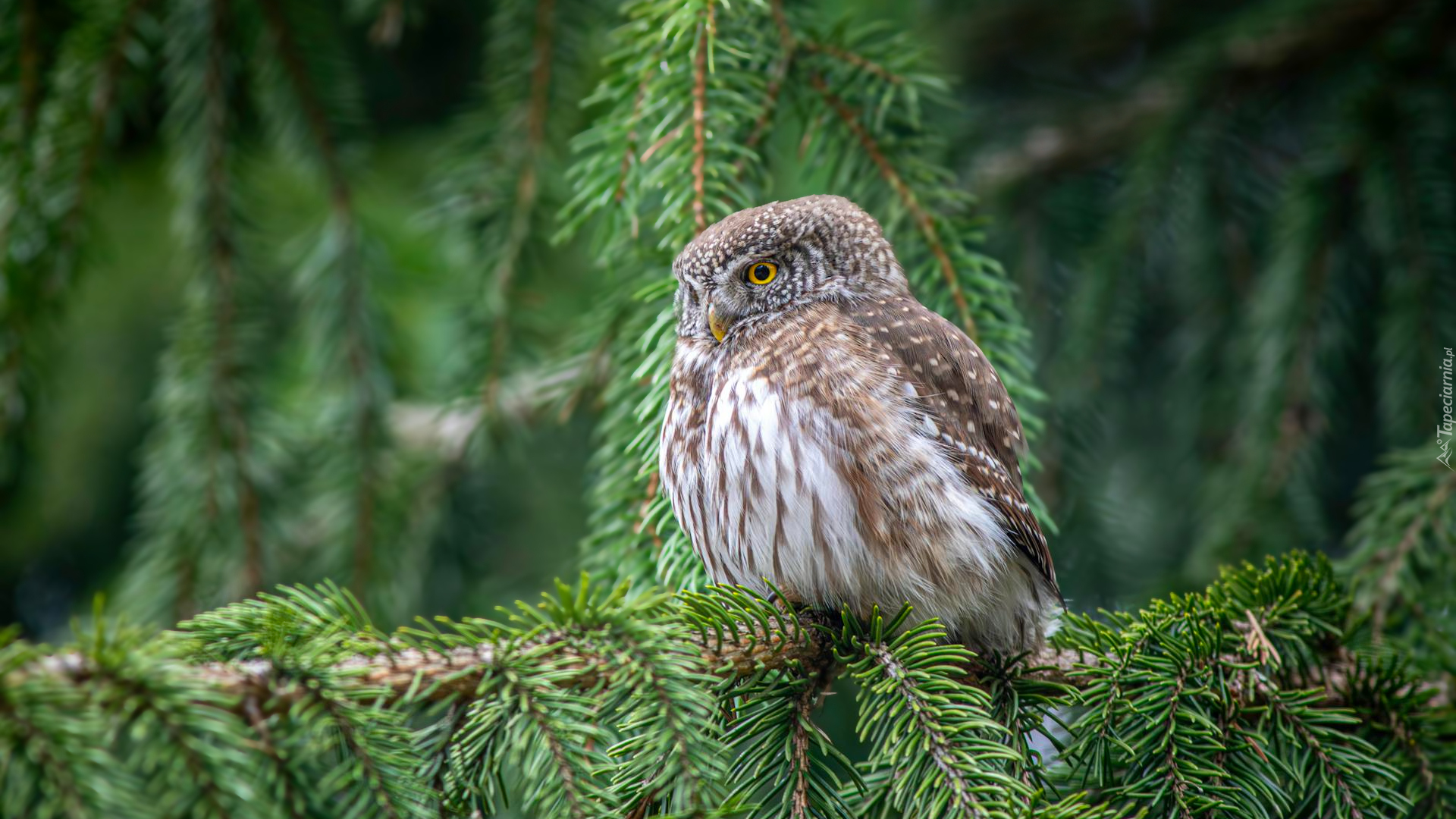Edytor tapety: Sóweczka zwyczajna na świerkowej gałęzi
