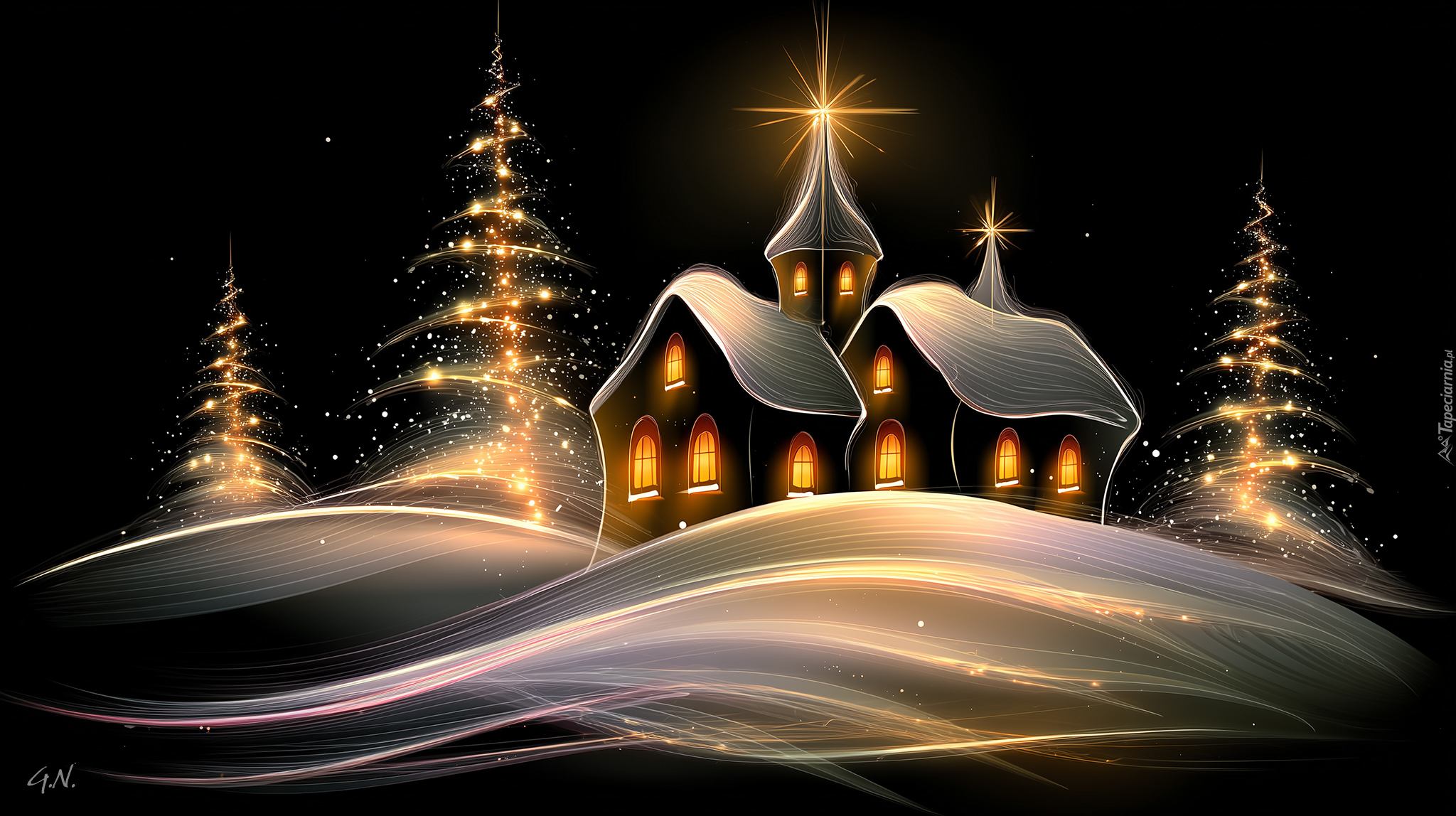Edytor tapety: Grafika rozświetlonego nocą kościoła i choinek