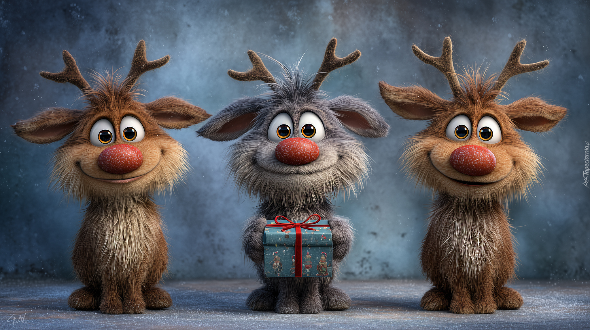Edytor tapety: Trzy uśmiechnięte renifery z prezentem