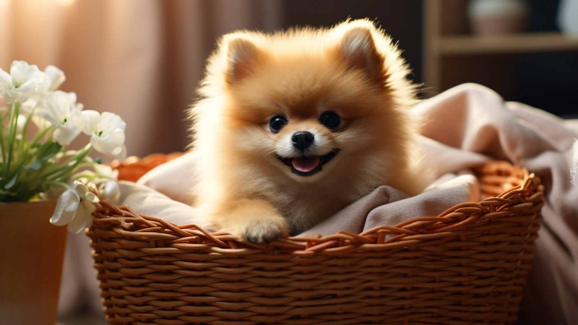 Edytor tapety: Szpic miniaturowy na posłaniu w koszu