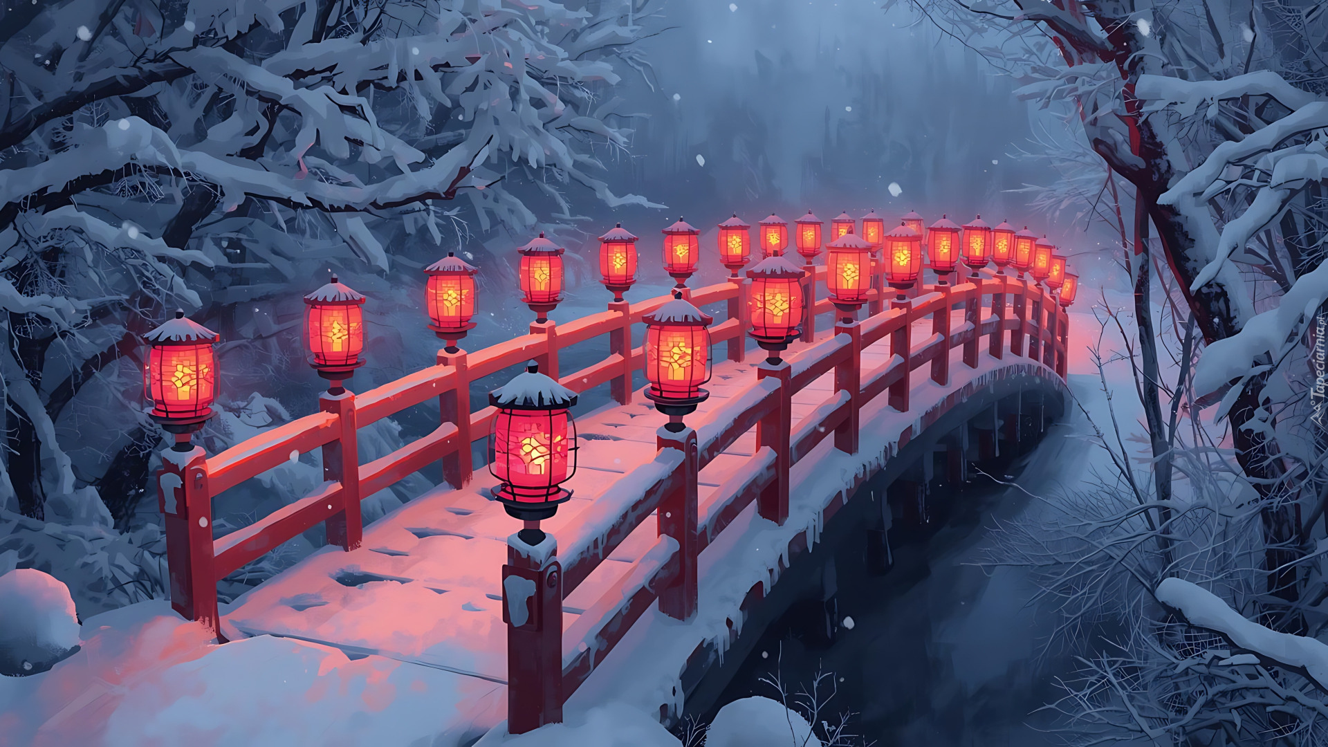 Edytor tapety: Zapalone latarnie na ośnieżonym czerwonym moście nad rzeką