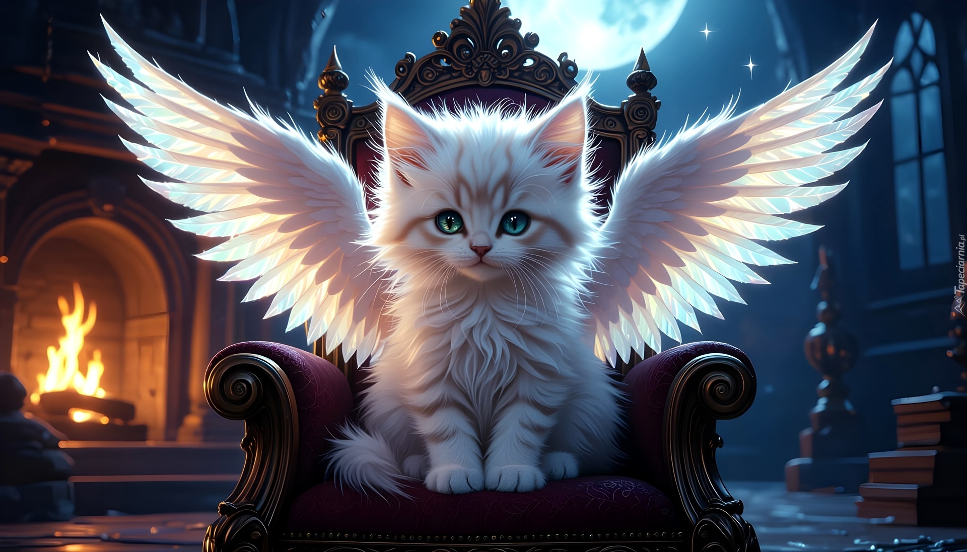 Edytor tapety: Biały kot ze skrzydłami na fotelu przy kominku