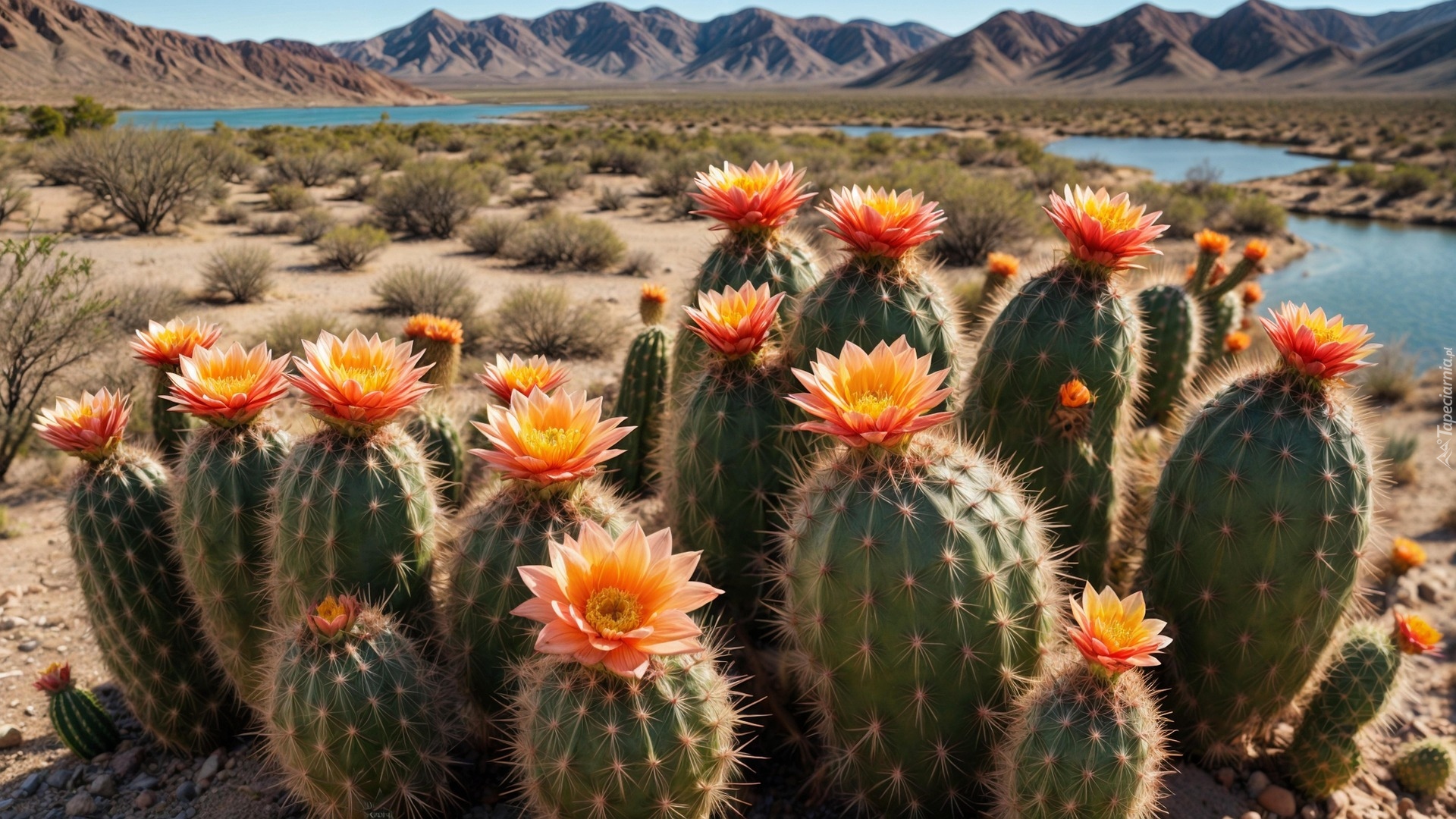 Edytor tapety: Pomarańczowe kwiaty na kwitnących kaktusach