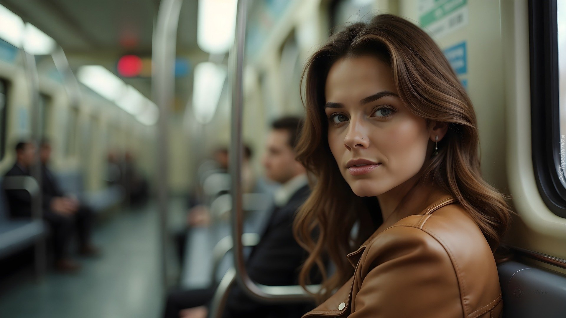 Edytor tapety: Spojrzenie długowłosej szatynki w skórzanej kurtce