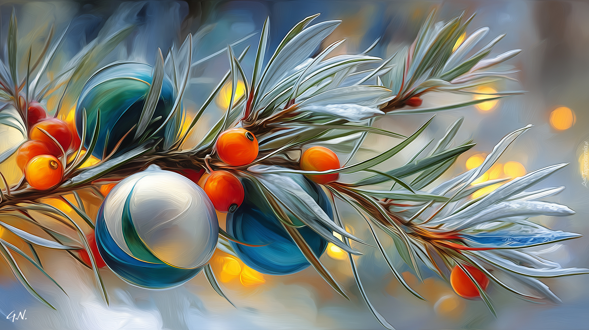 Edytor tapety: Kolorowe bombki i owoce na gałązce iglastej
