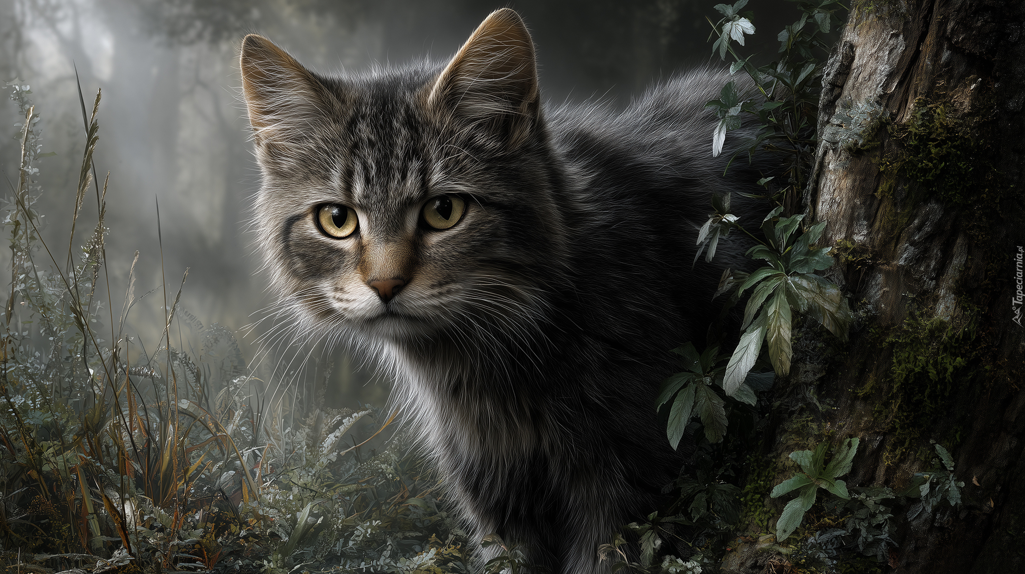 Edytor tapety: Szary kot stojący obok drzewa i suchych roślin