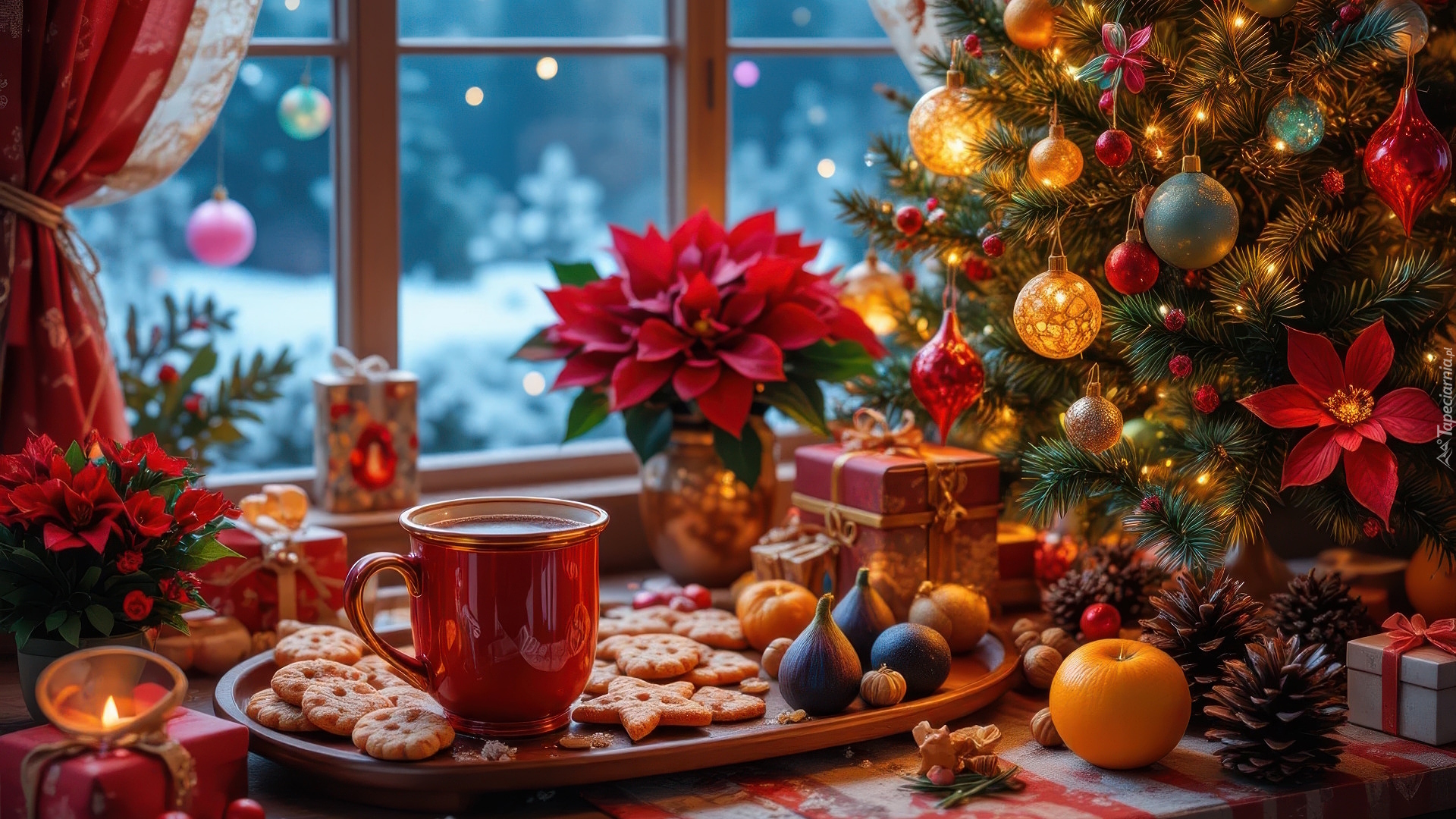 Edytor tapety: Kubek z kawą i ciasteczka obok udekorowanej choinki