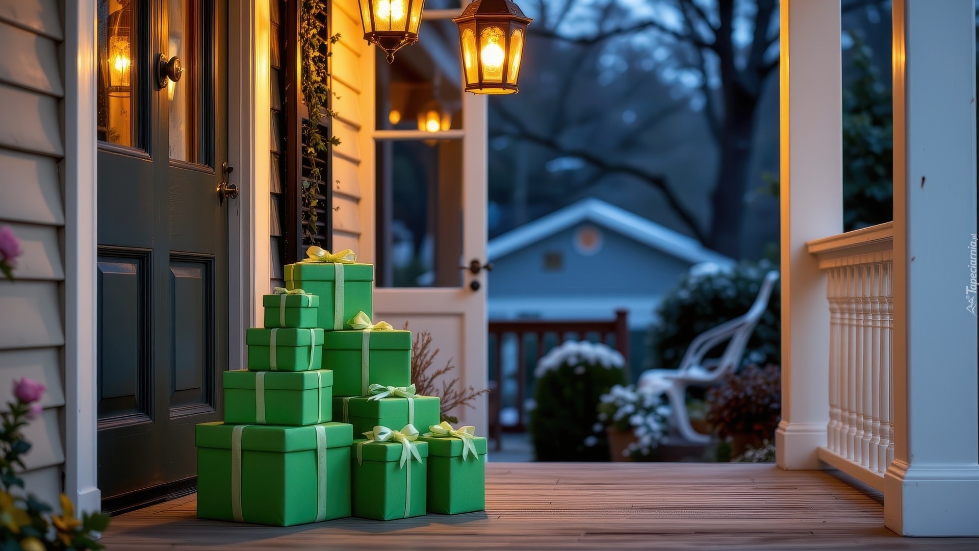 Edytor tapety: Zielone pudełka z prezentami przed drzewami na tarasie