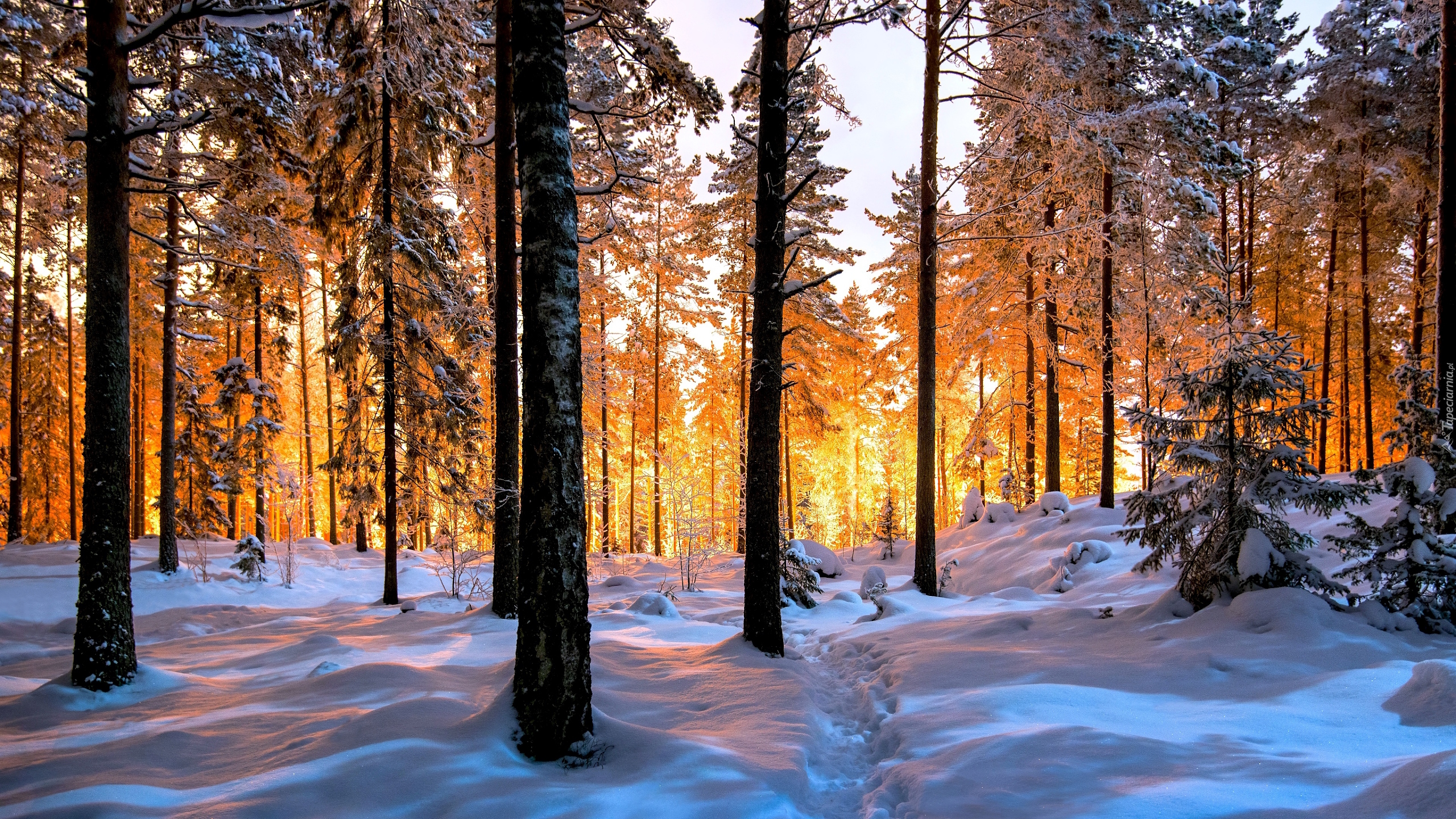 Edytor tapety: Zima w rozświetlonym słońcem lesie