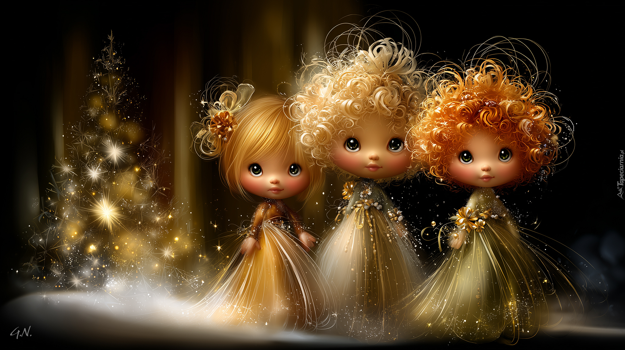 Edytor tapety: Trzy lalki w długich sukienkach obok rozświetlonej choinki