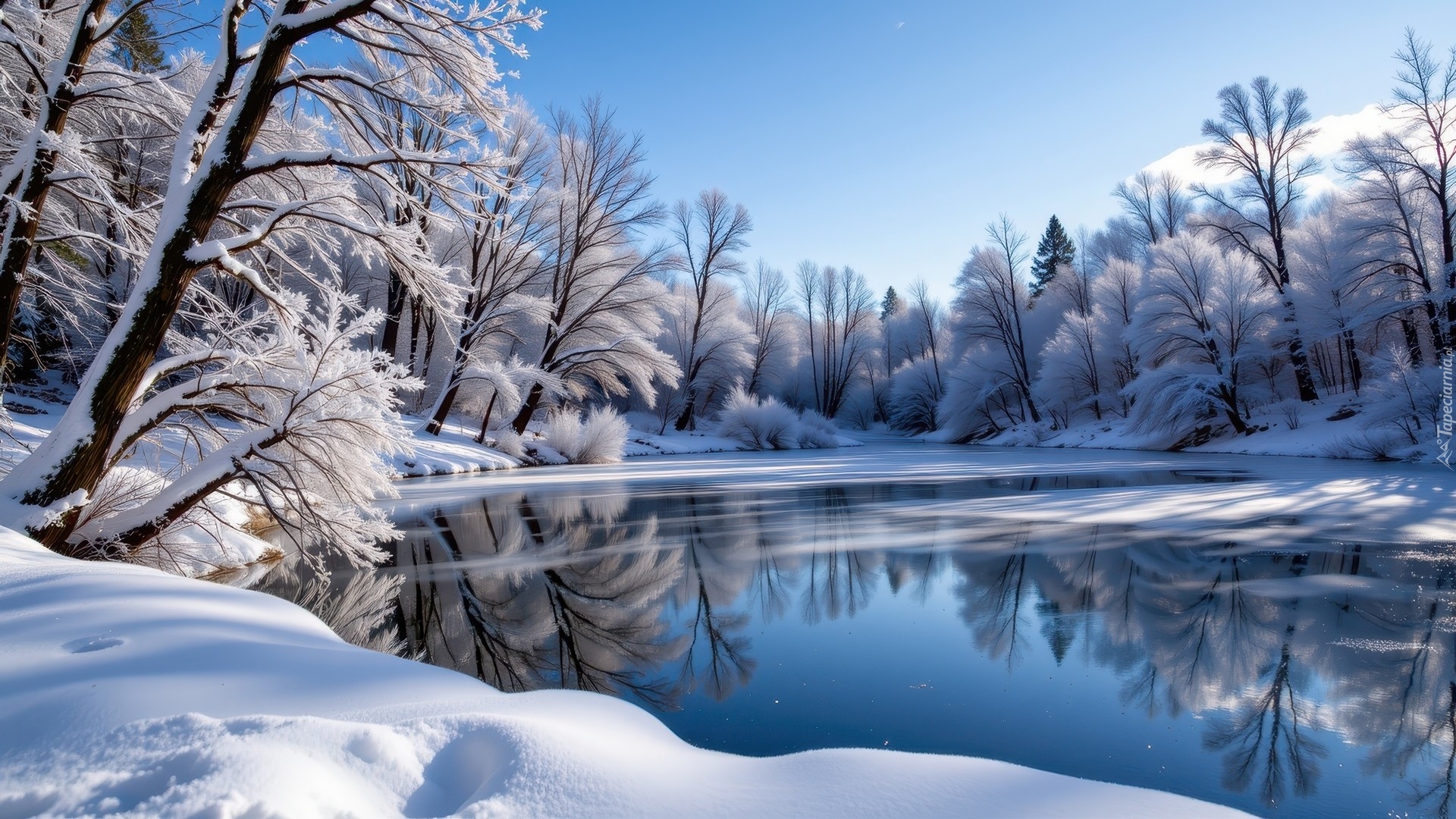 Edytor tapety: Oszronione drzewa nad jeziorem zimową porą