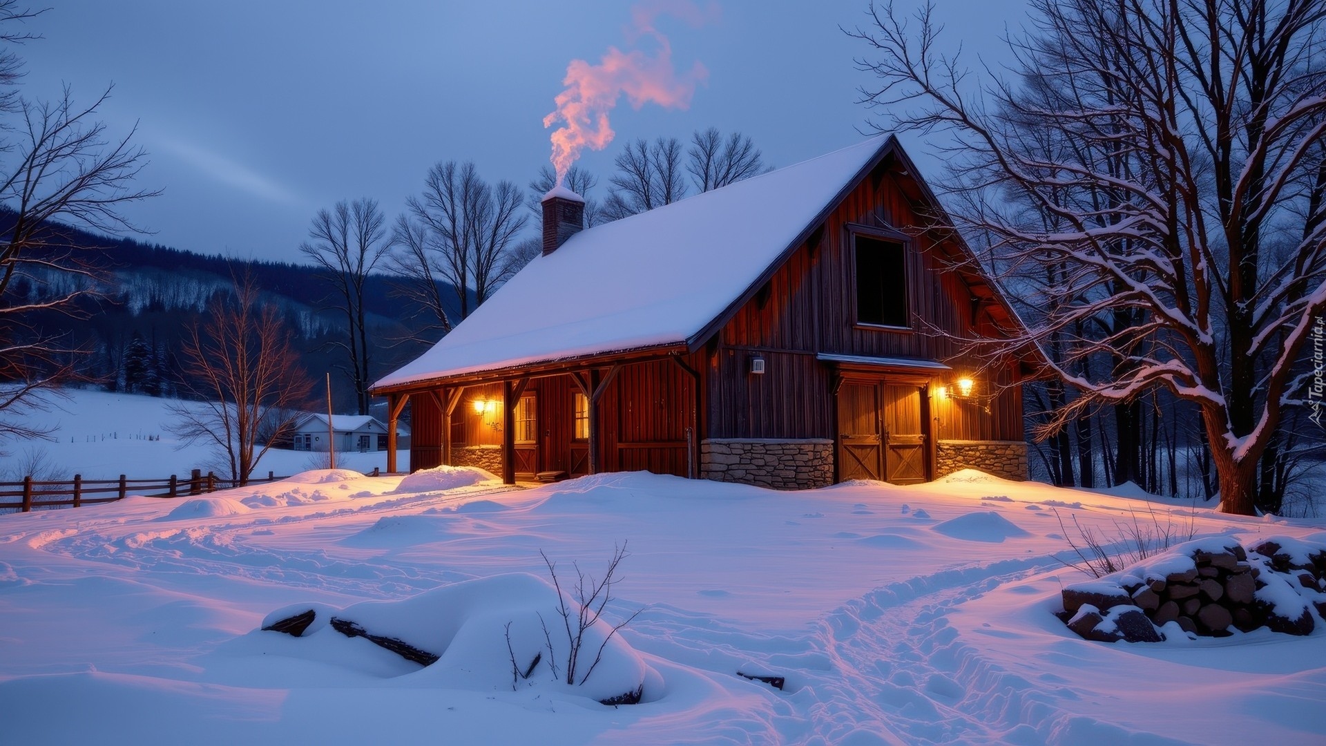 Edytor tapety: Ośnieżone drzewa i oświetlony dom w zimowej scenerii