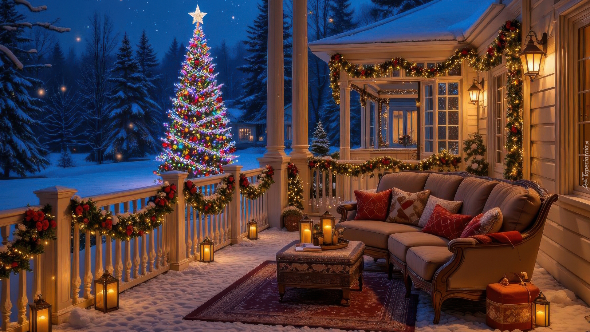 Edytor tapety: Udekorowany świątecznie taras i oświetlona choinka na śniegu
