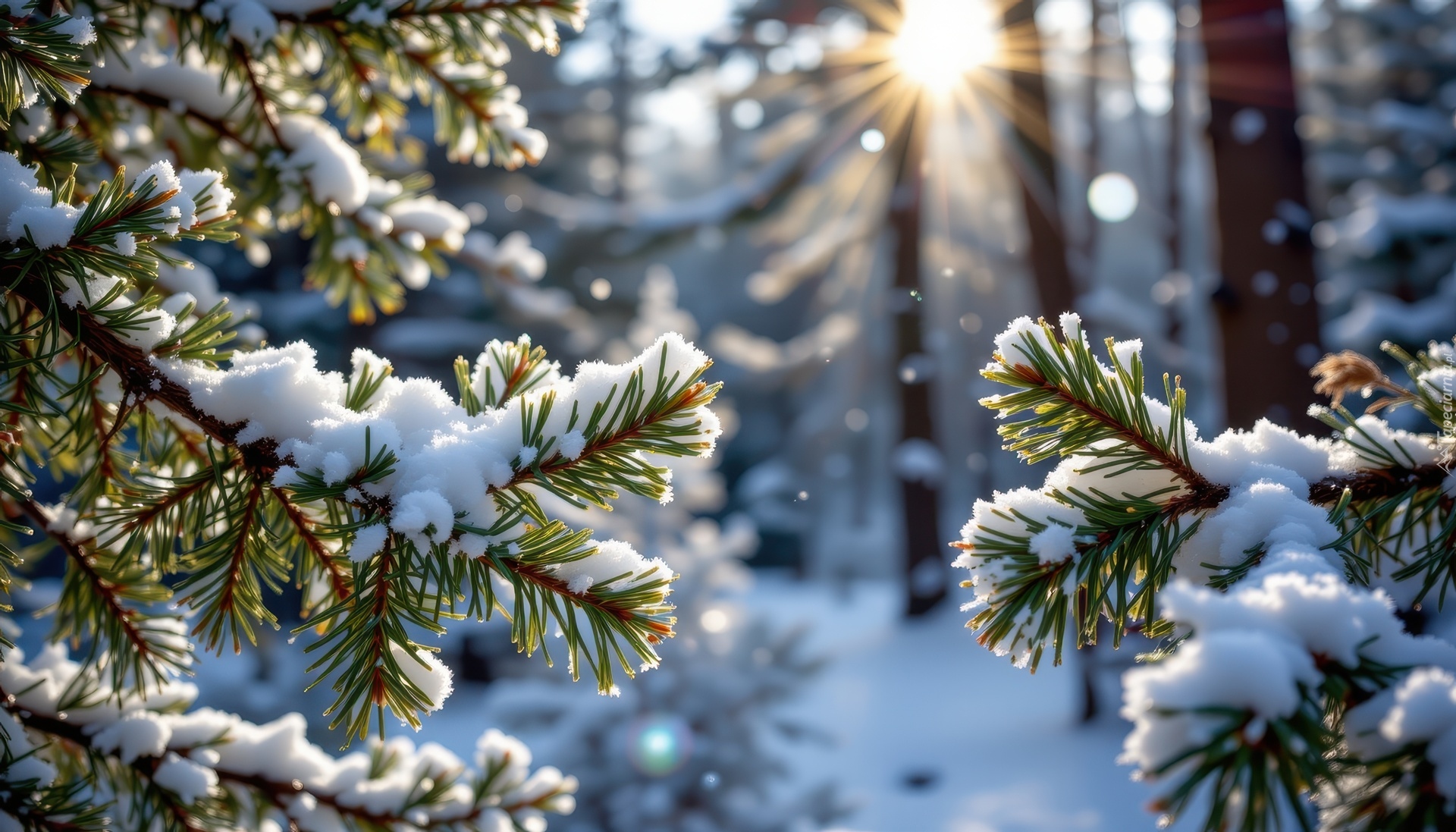 Edytor tapety: Ośnieżone świerkowe gałązki rozświetlone promieniami słońca