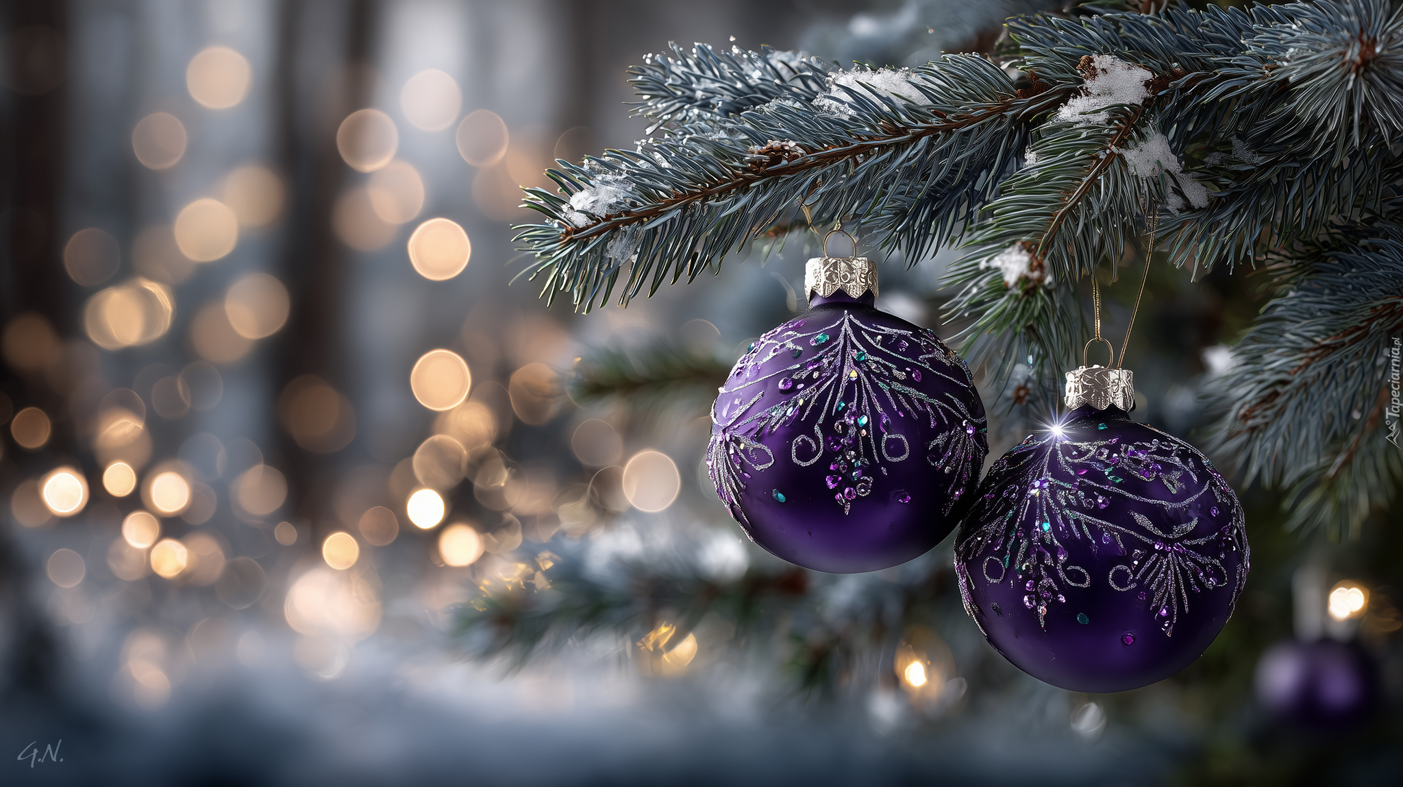 Edytor tapety: Dwie fioletowe bombki na świerkowych gałązkach