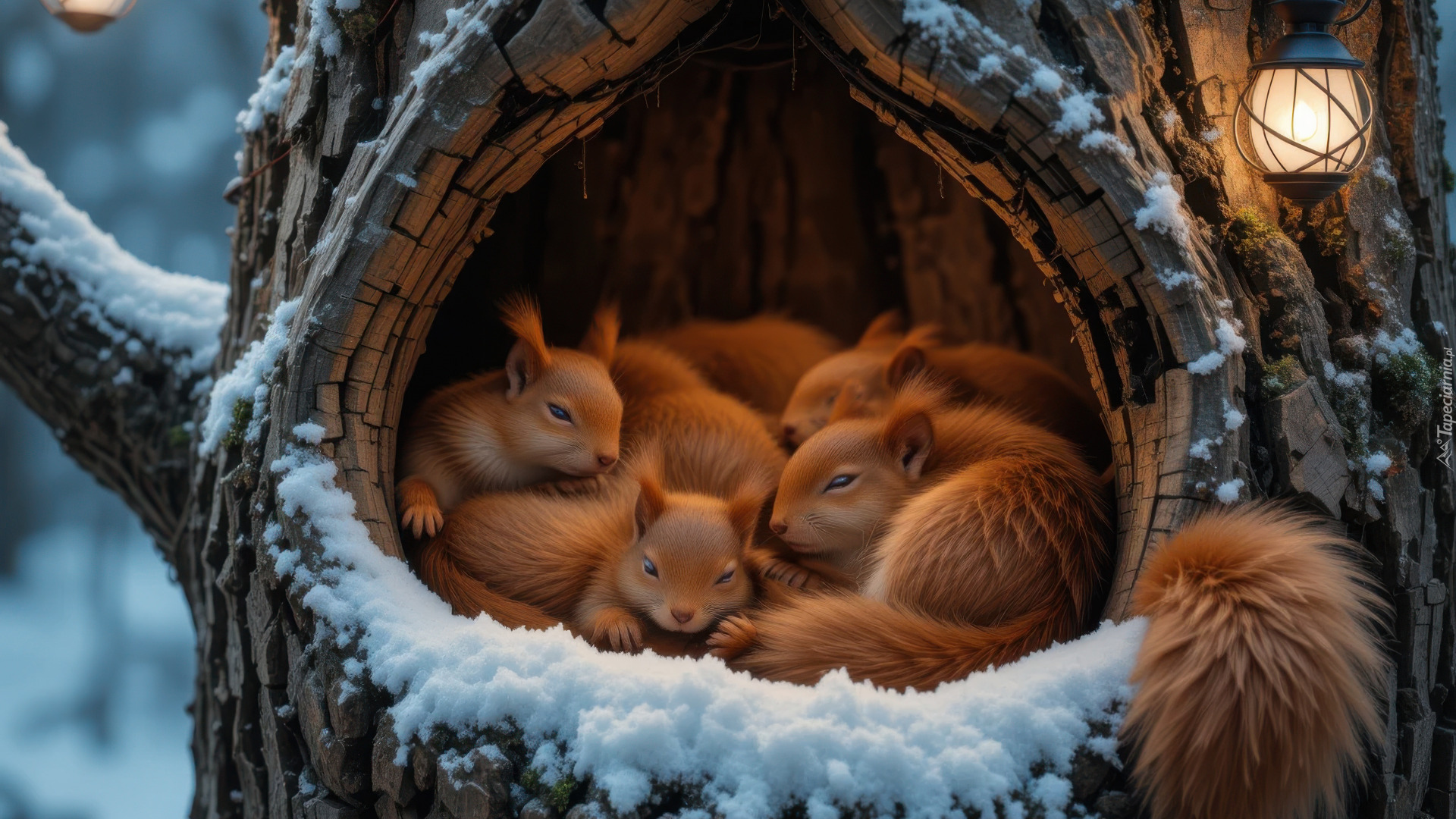 Edytor tapety: Zapalona lampka nad ośnieżoną dziuplą z rudymi wiewiórkami