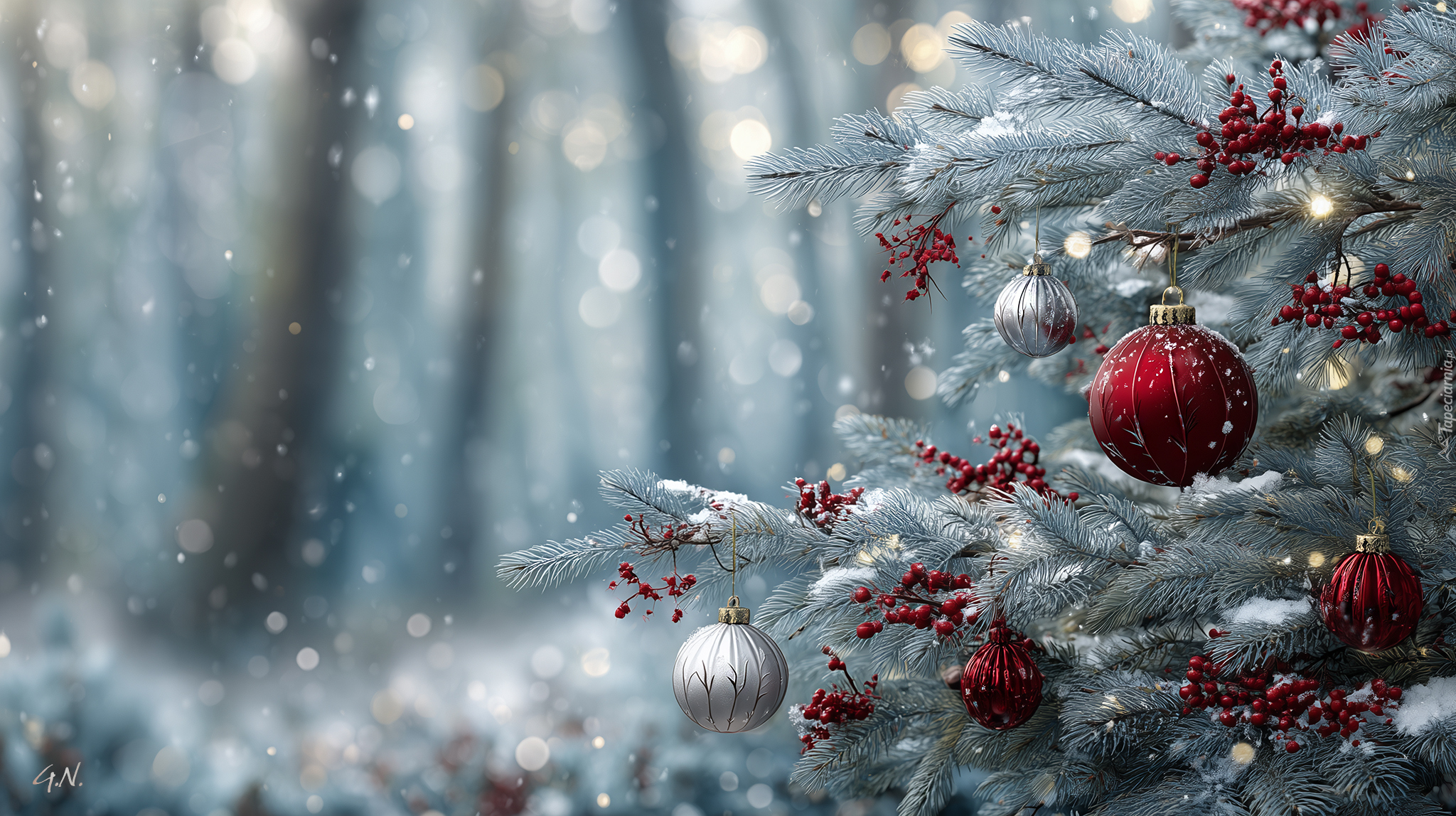 Edytor tapety: Czerwone i srebrne bombki na ośnieżonej choince