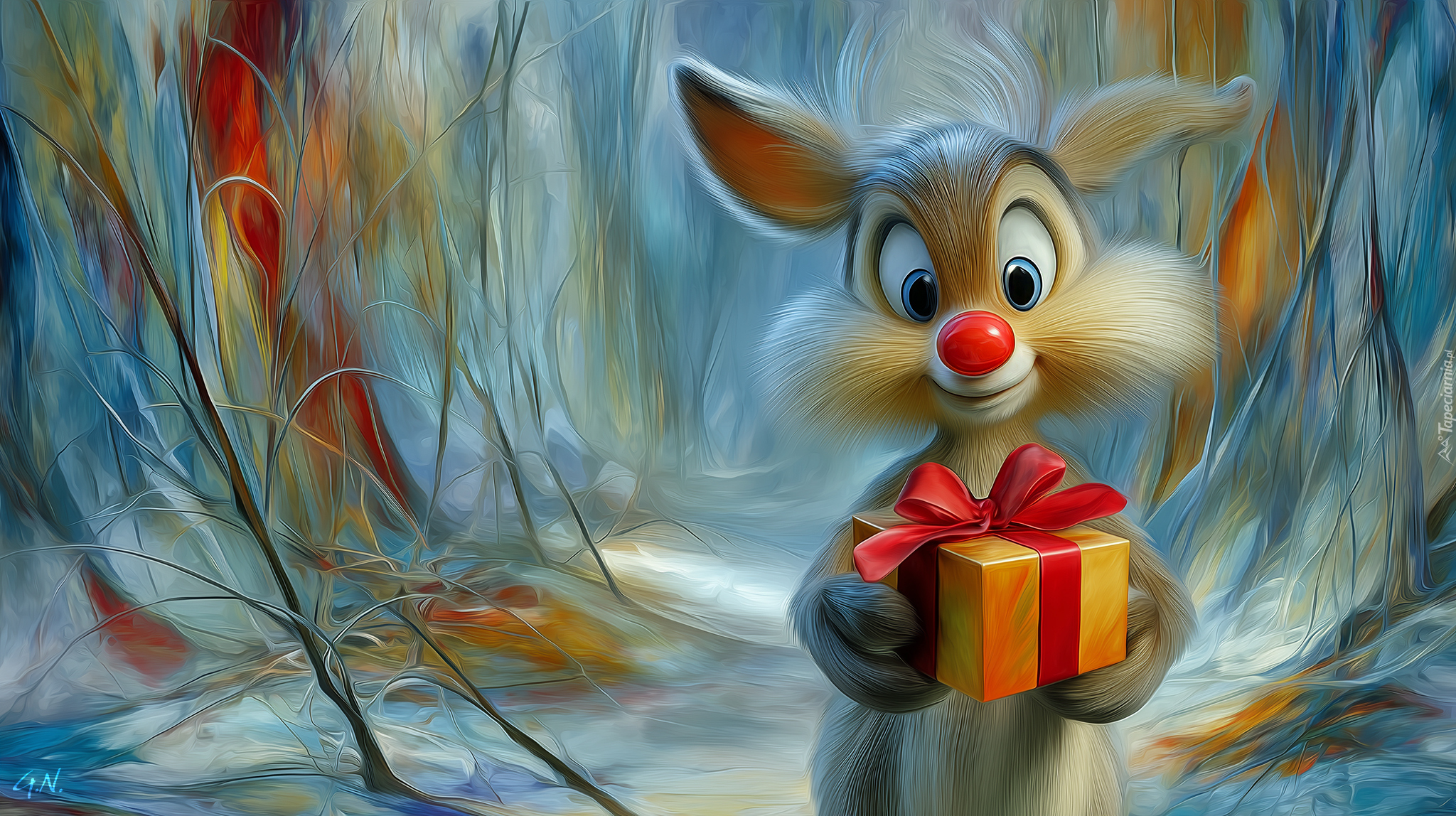 Edytor tapety: Renifer z czerwonym nosem i prezentem w grafice