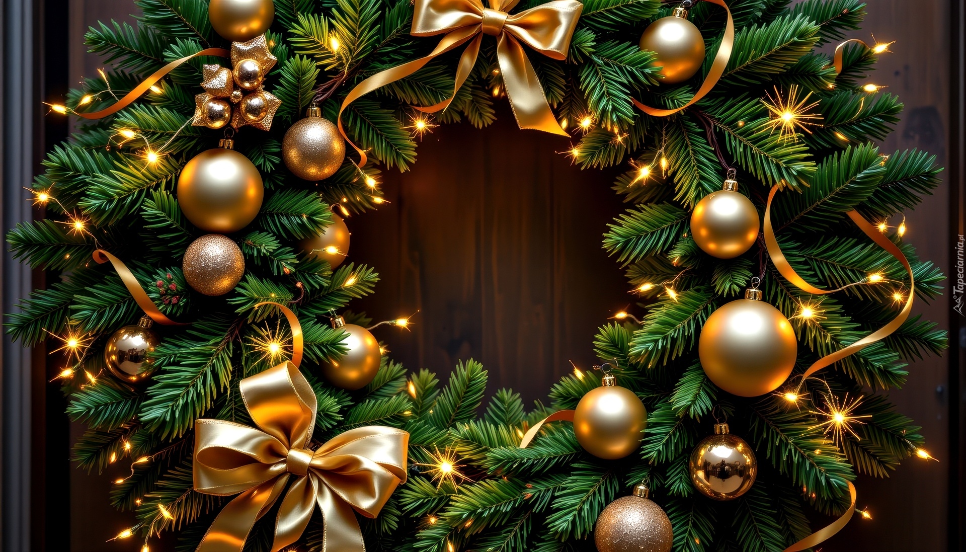 Edytor tapety: Świąteczny wianek ze złotymi kokardami i bombkami