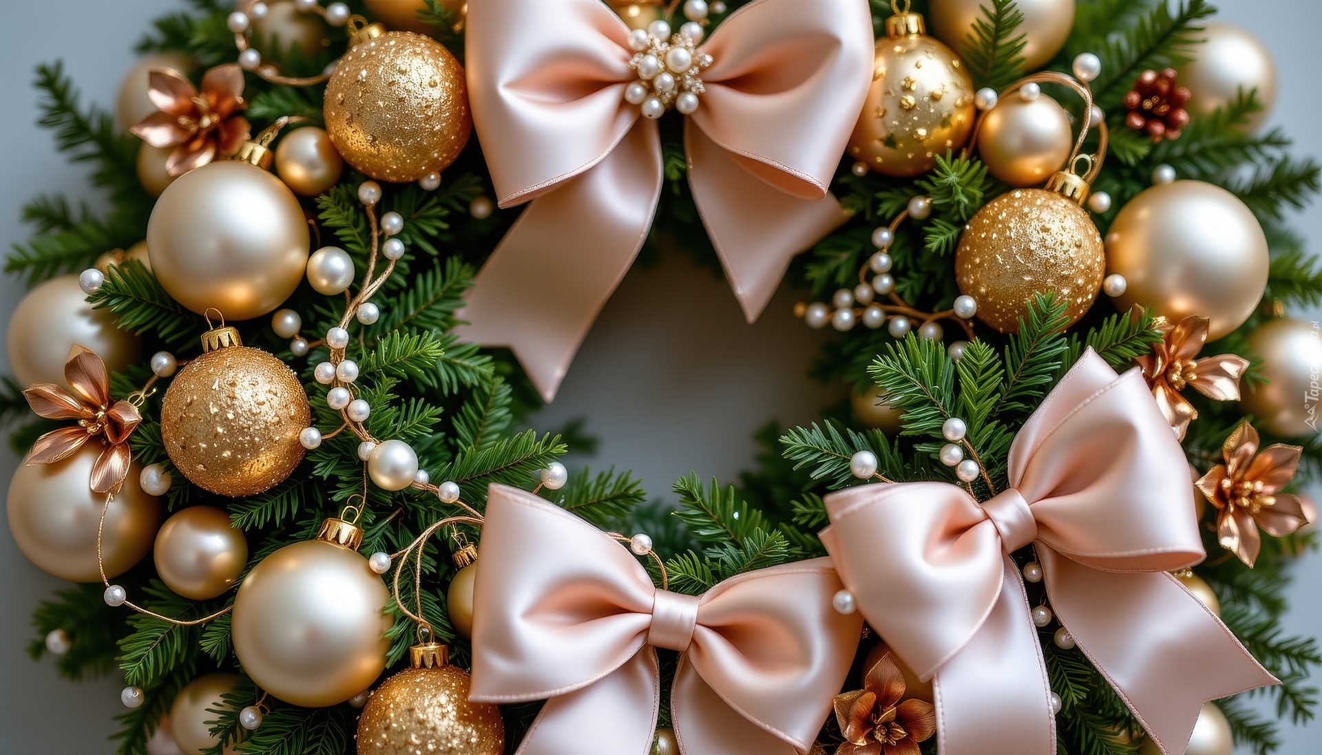 Edytor tapety: Wieniec z jasnoróżowymi kokardami i złotymi bombkami