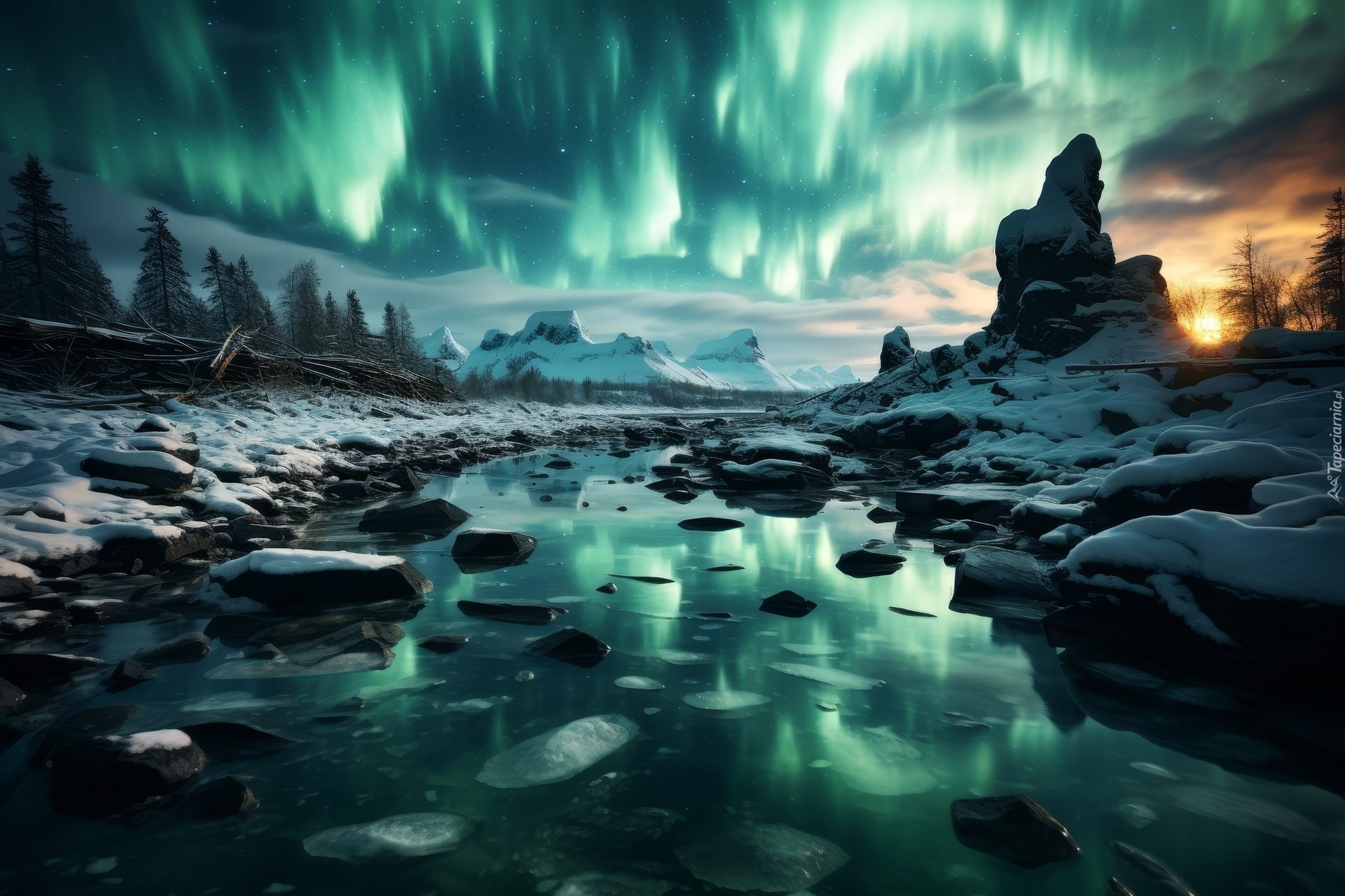 Edytor tapety: Skały nad rzeką w blasku zorzy polarnej