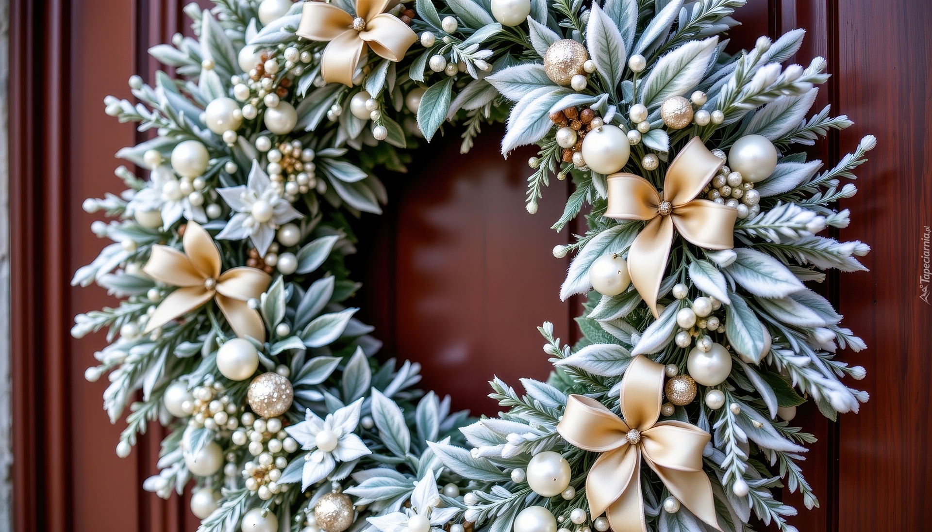Edytor tapety: Oszroniony wieniec ozdobiony kokardkami i bombkami