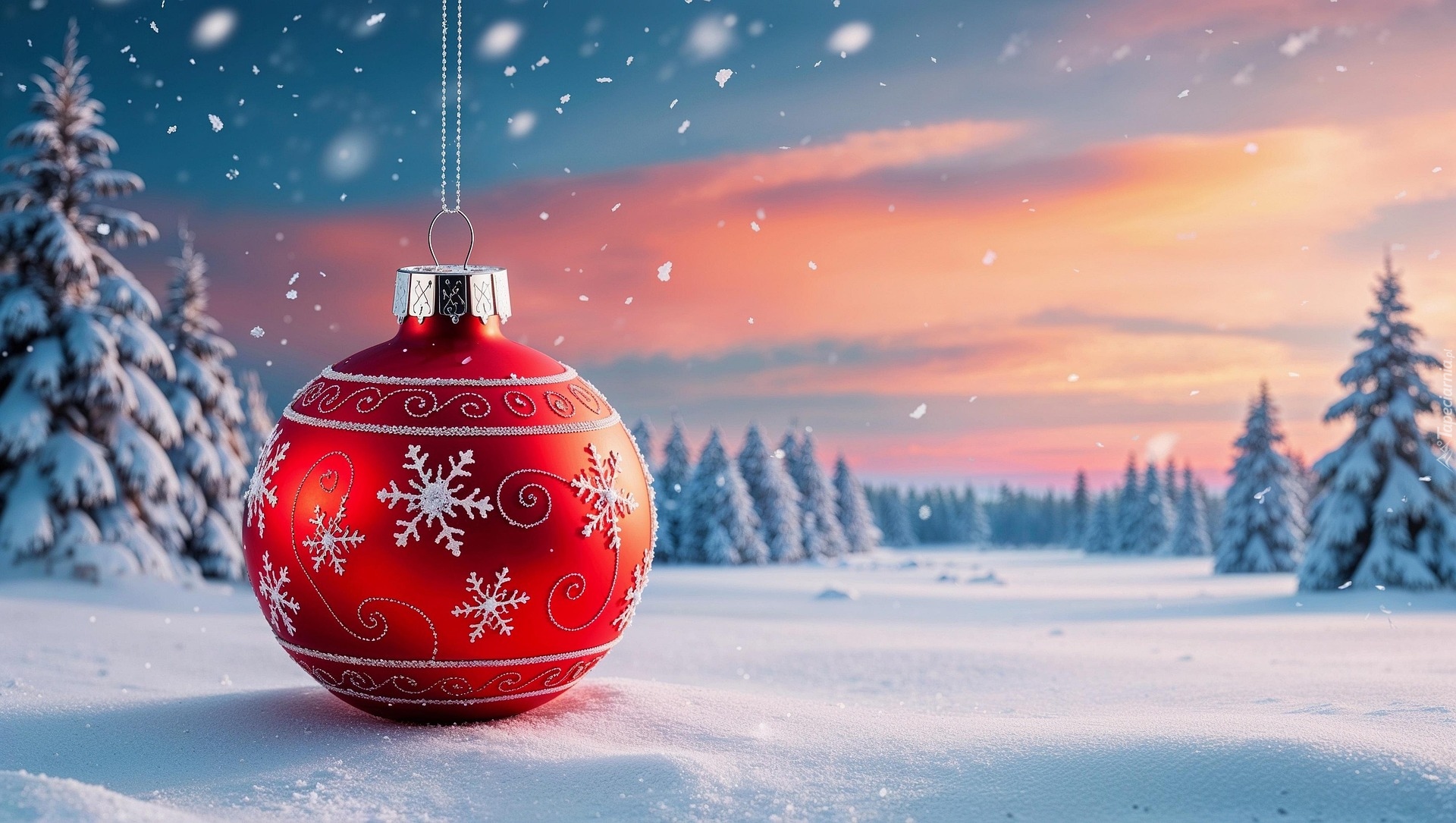 Edytor tapety: Czerwona bombka na śniegu obok ośnieżonych choinek