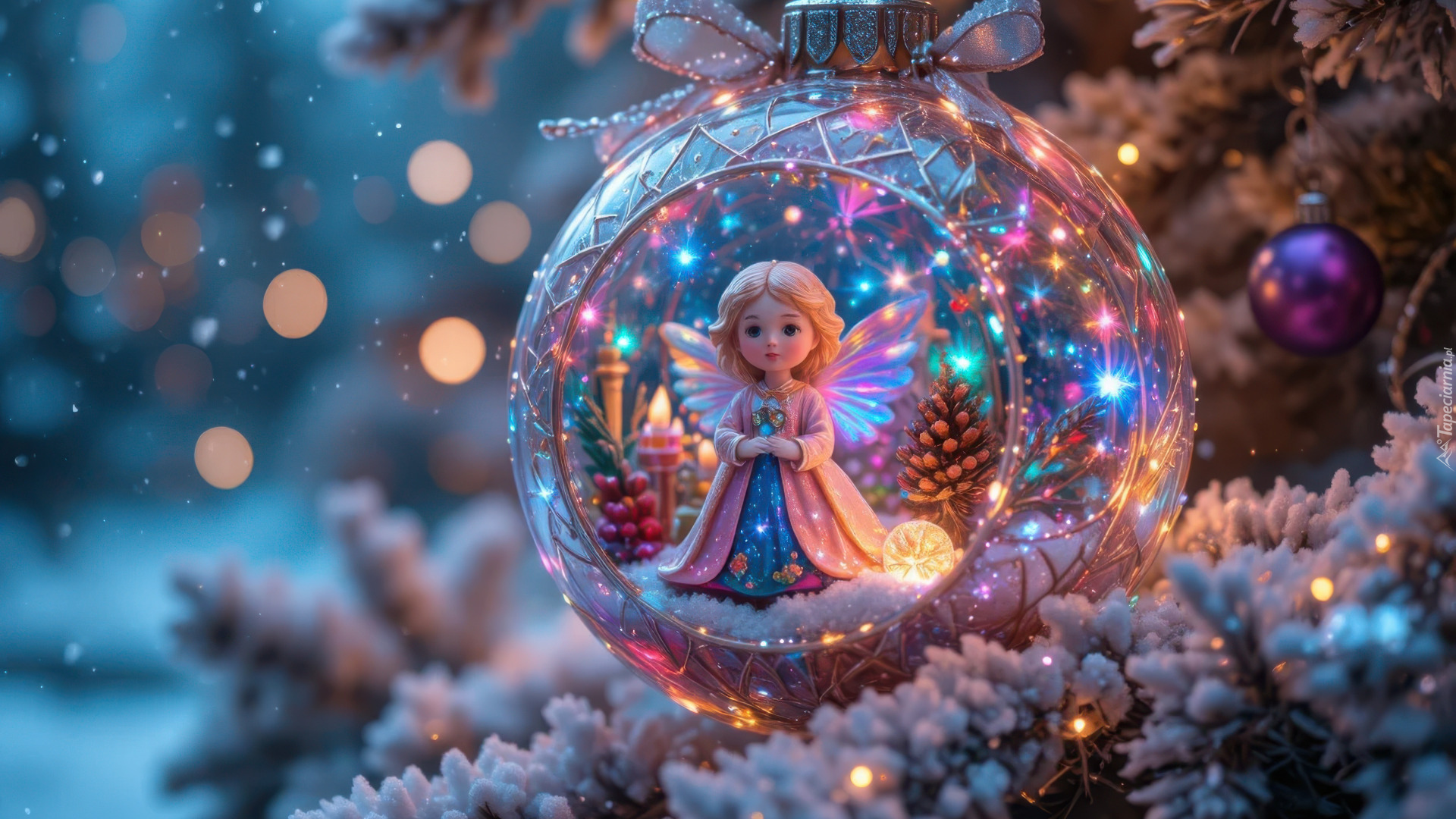 Edytor tapety: Bombka z aniołkiem na ośnieżonej gałązce choinki