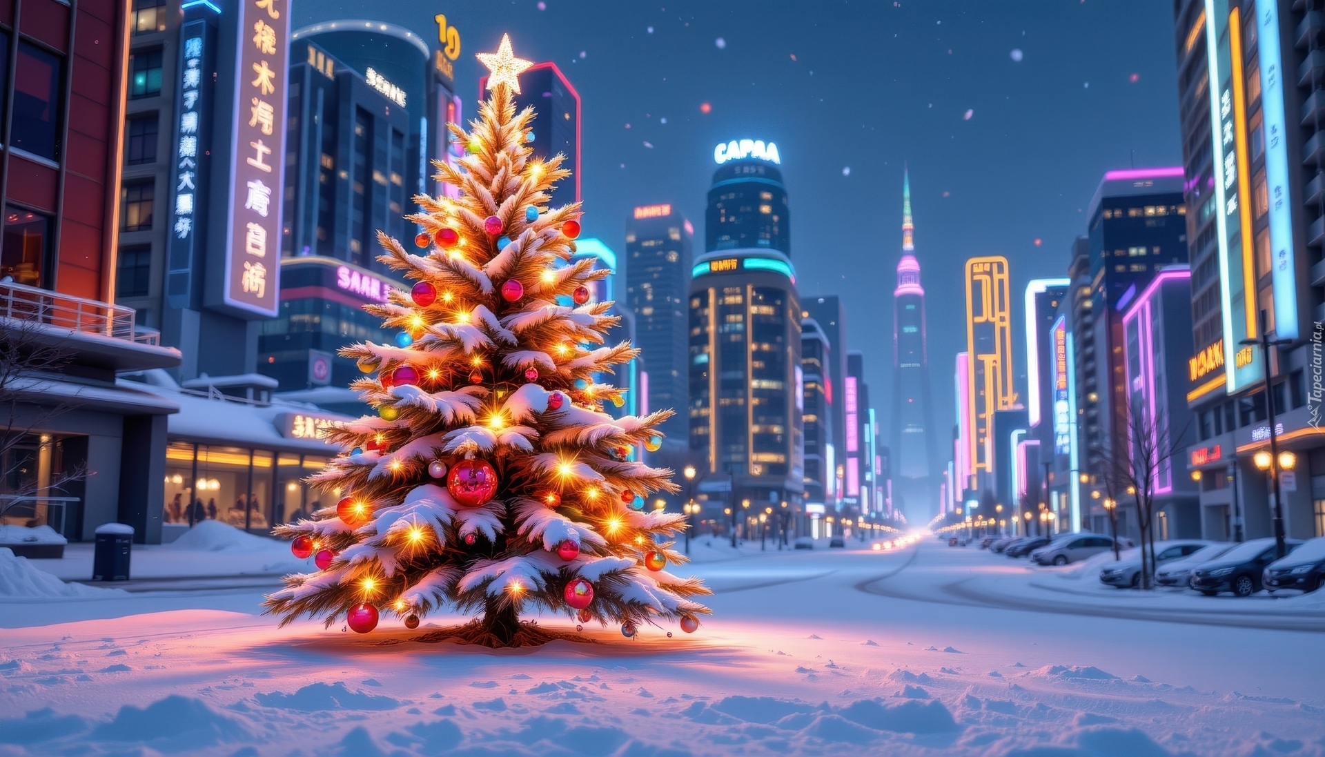 Edytor tapety: Rozświetlona udekorowana choinka oraz wieżowce na ośnieżonej ulicy