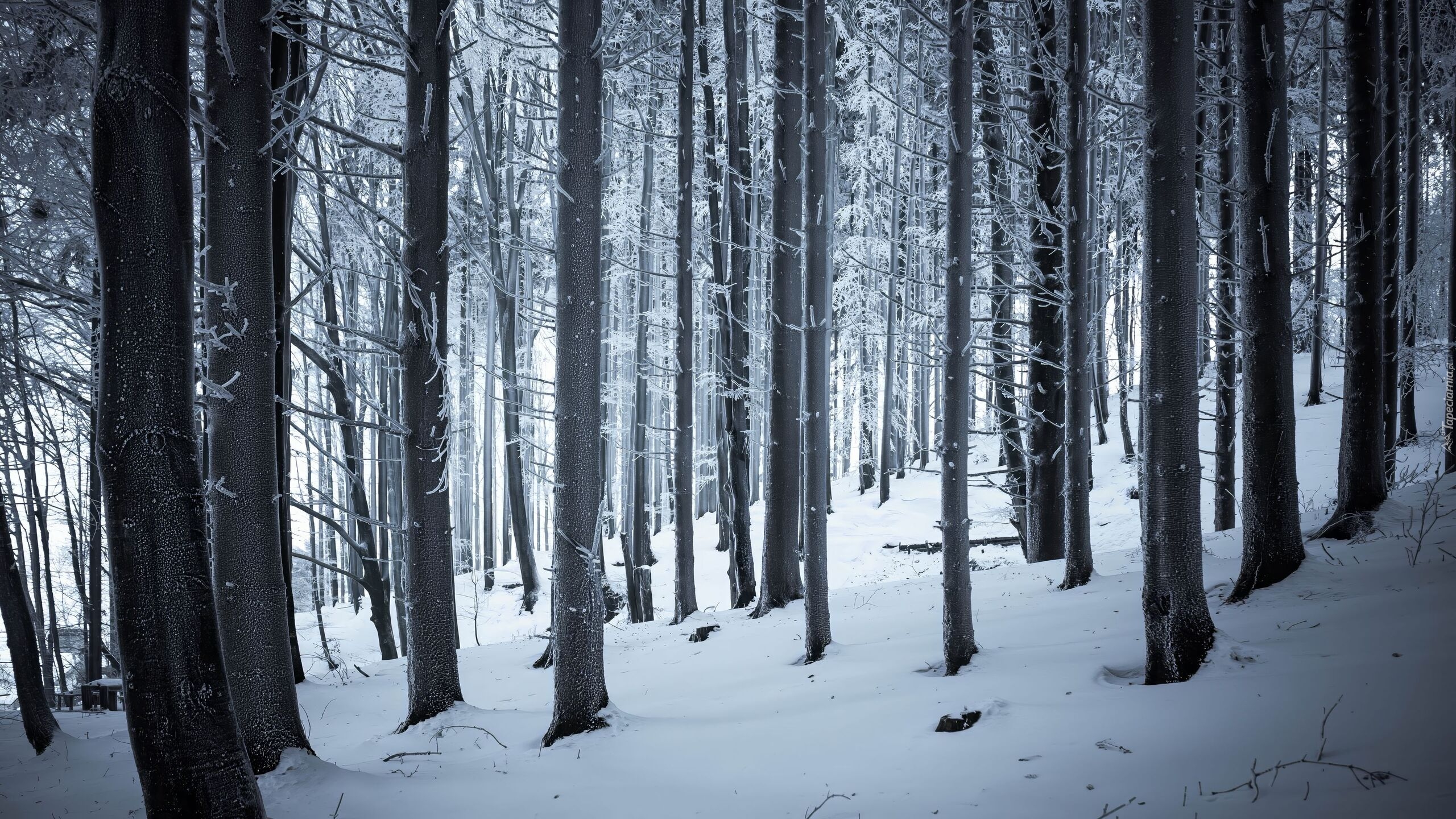 Edytor tapety: Ośnieżone wysokie drzewa w zimowym lesie