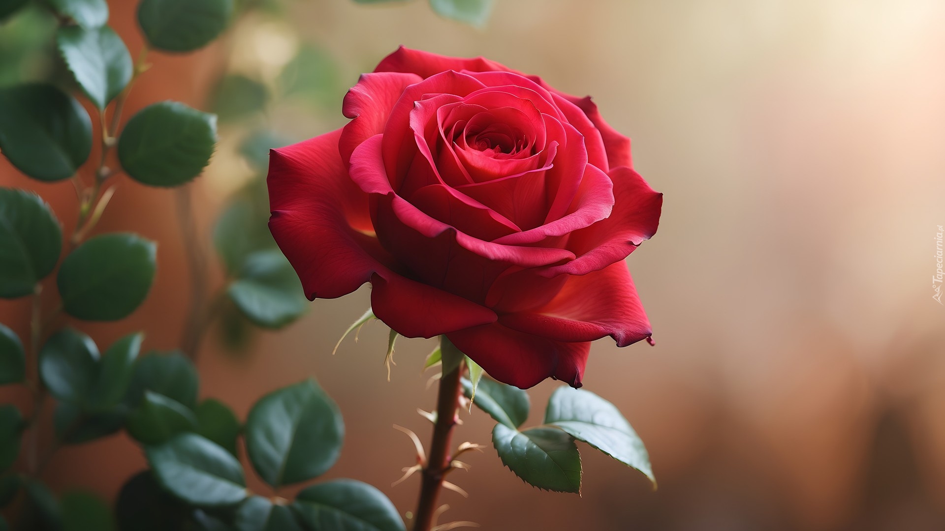 Edytor tapety: Rozkwitająca czerwona róża z listkami