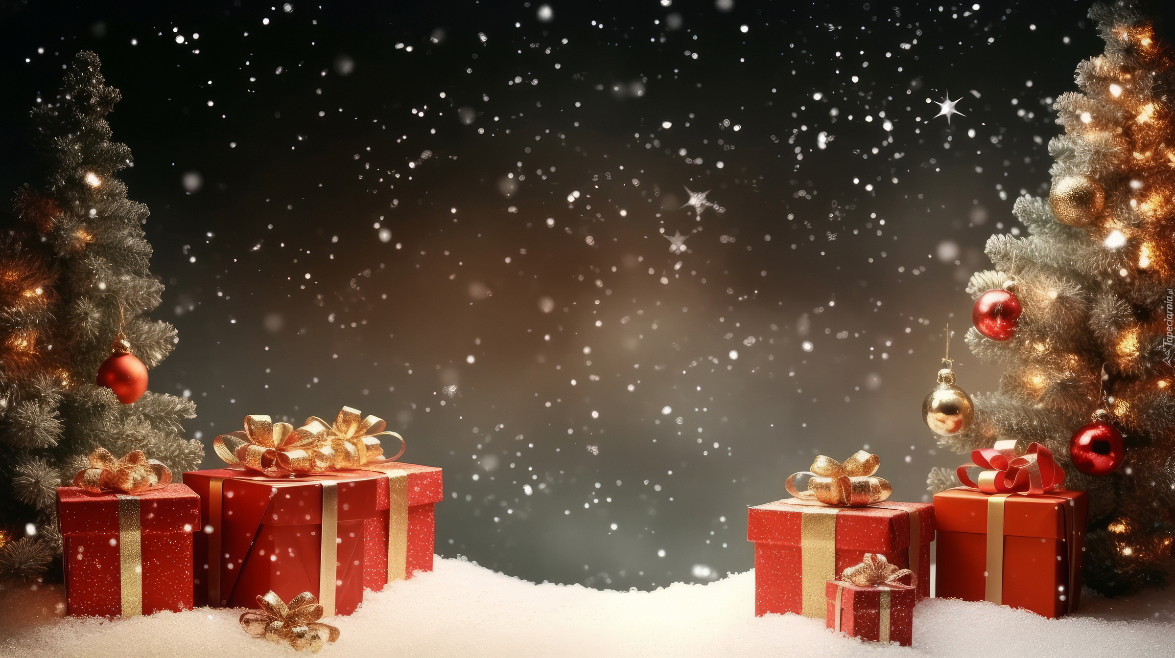 Edytor tapety: Czerwone pudełka z prezentami na śniegu pod choinkami