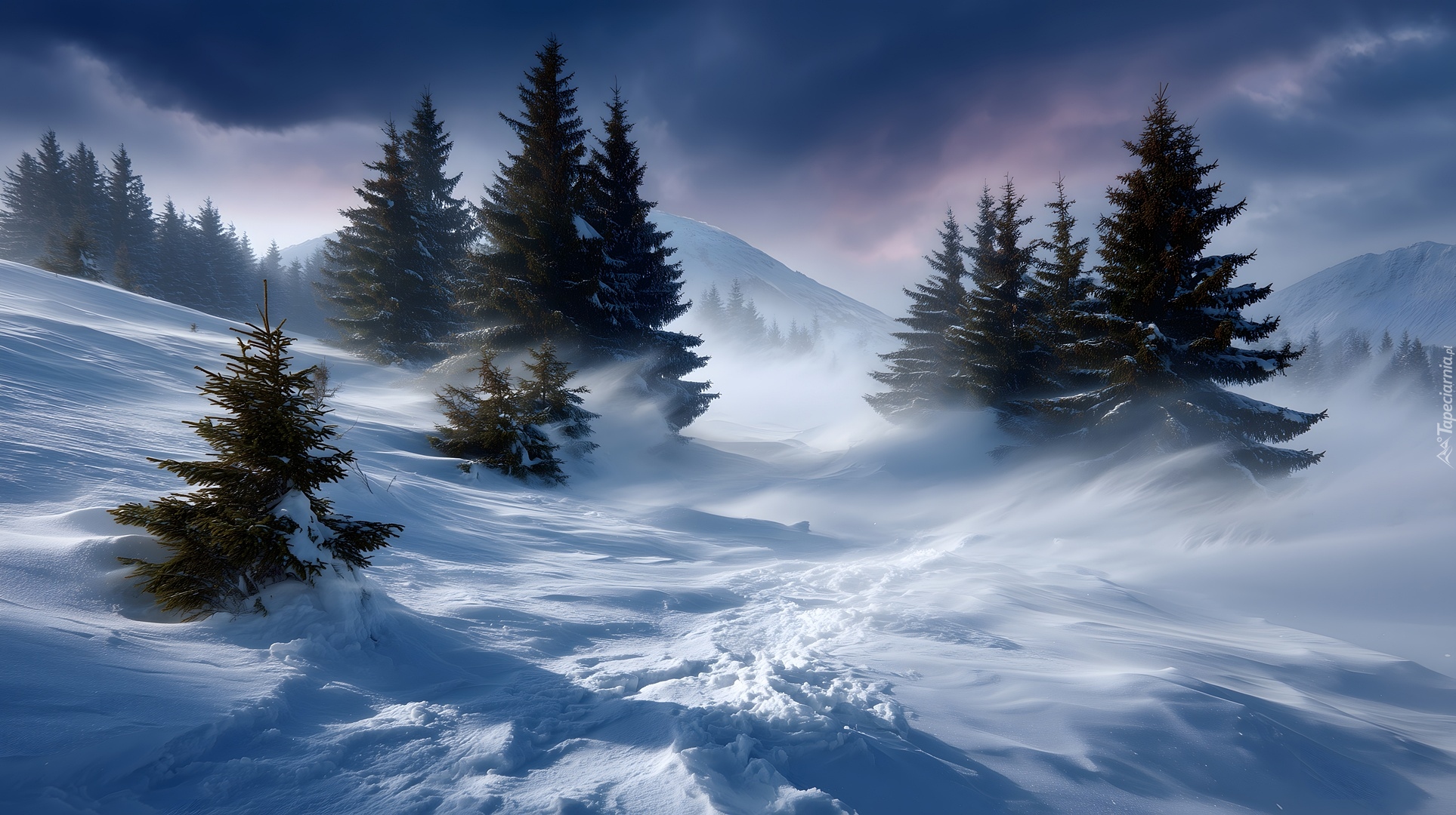 Edytor tapety: Drzewa na zboczu góry podczas zamieci śnieżnej
