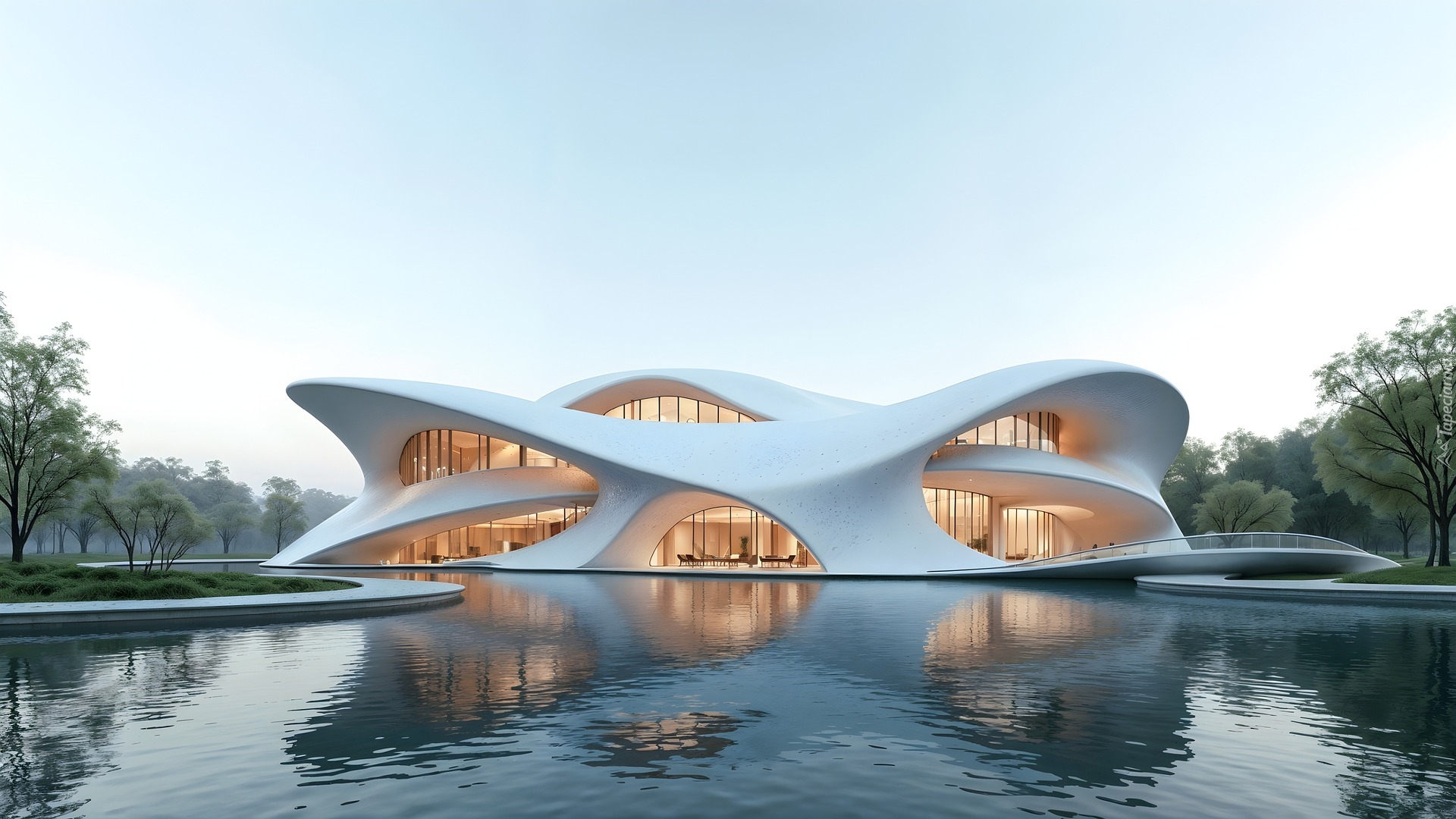 Edytor tapety: Oświetlony nowoczesny budynek nad wodą