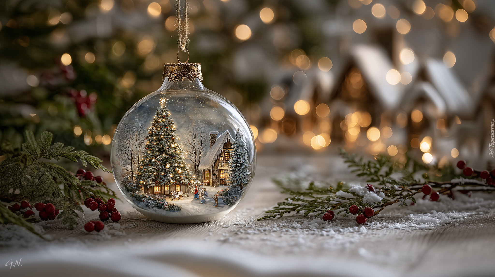 Edytor tapety: Bombka z domkiem i choinką obok iglastych gałązek