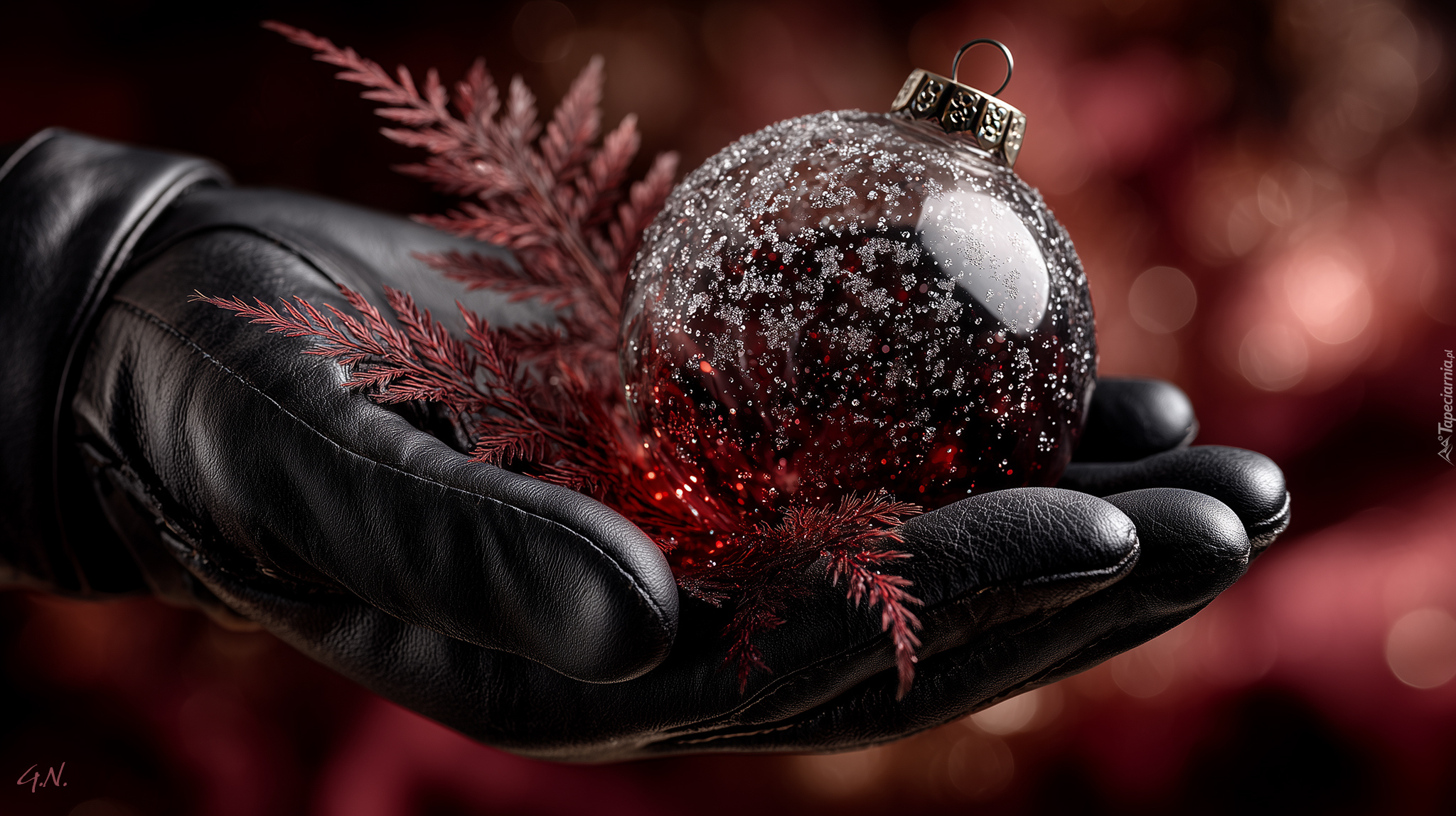 Edytor tapety: Ośnieżona ozdobna bombka na dłoni w czarnej rękawiczce