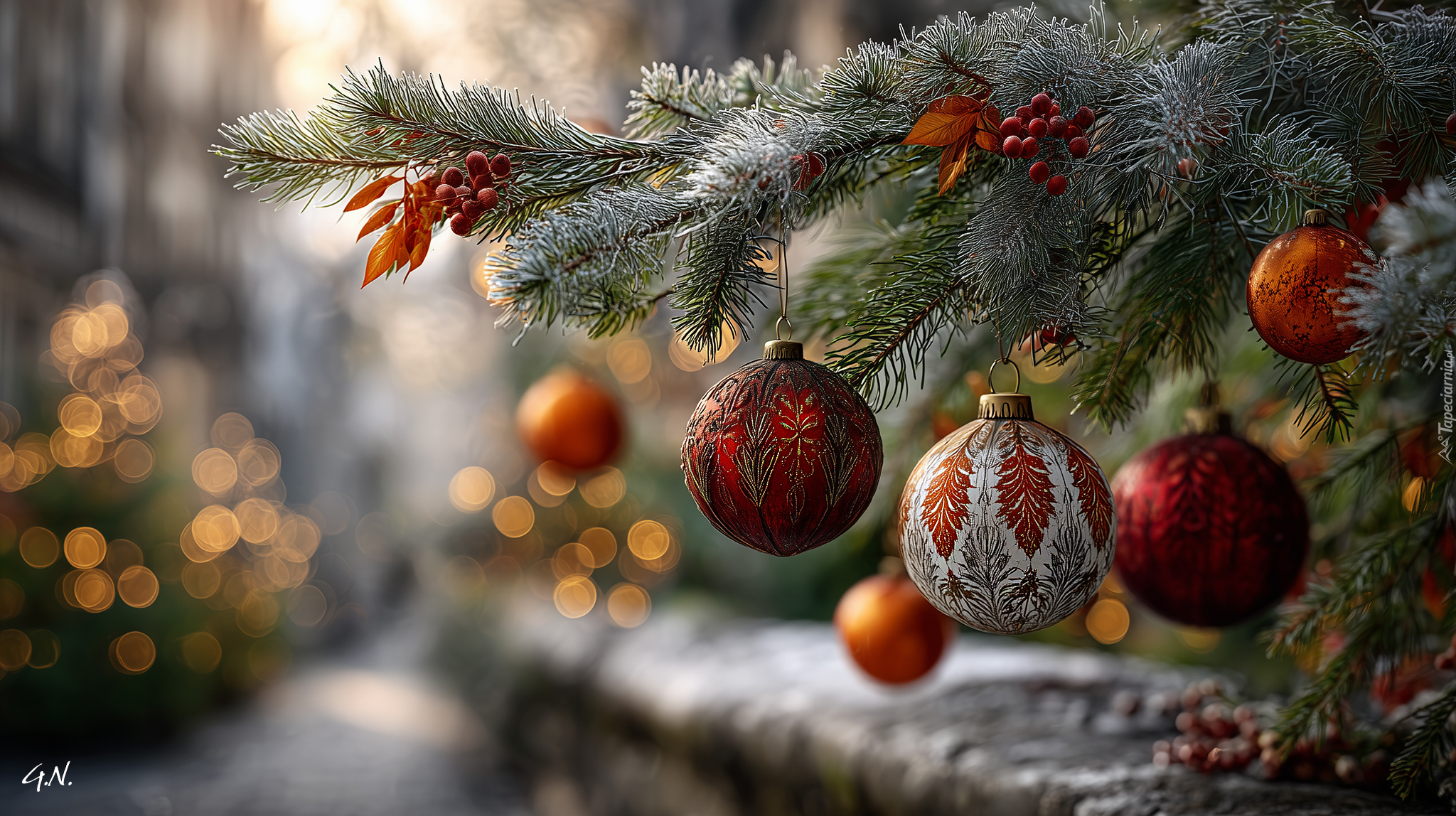 Edytor tapety: Kolorowe bombki na gałązkach choinki