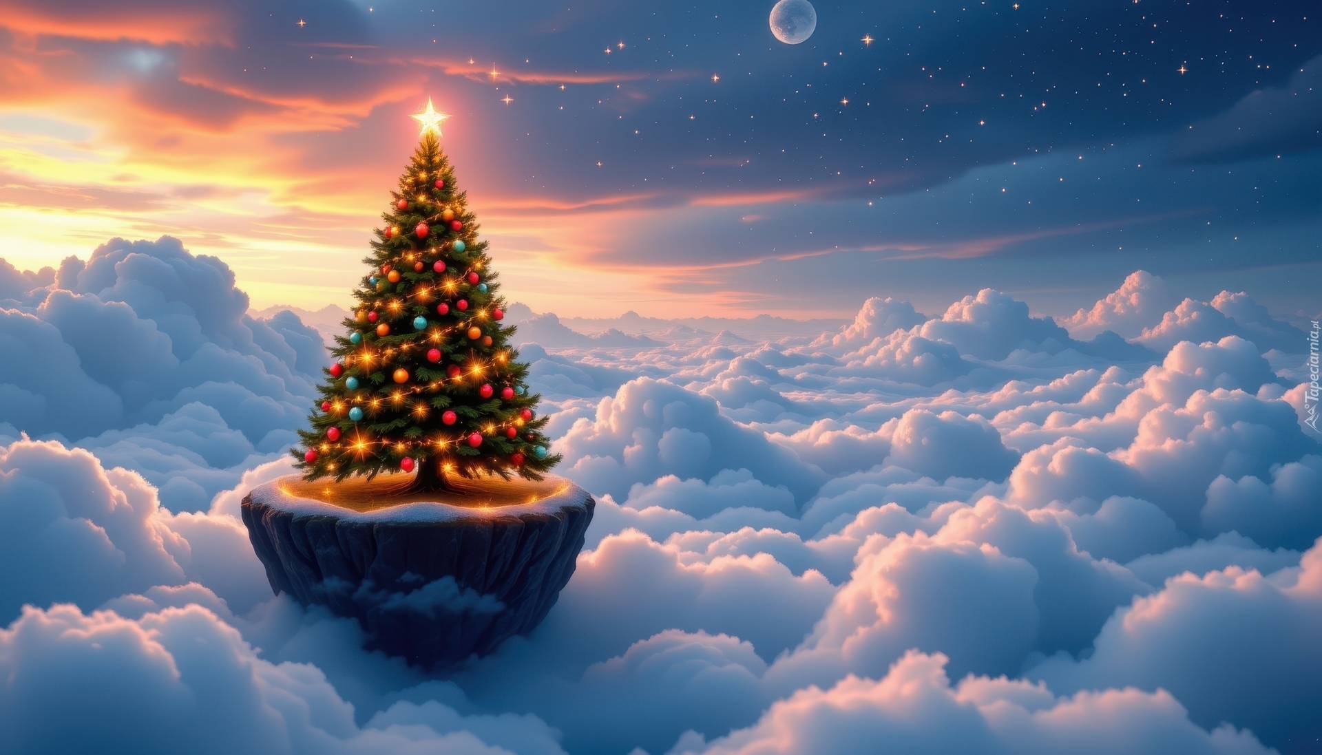Edytor tapety: Rozświetlona udekorowana choinka na chmurach