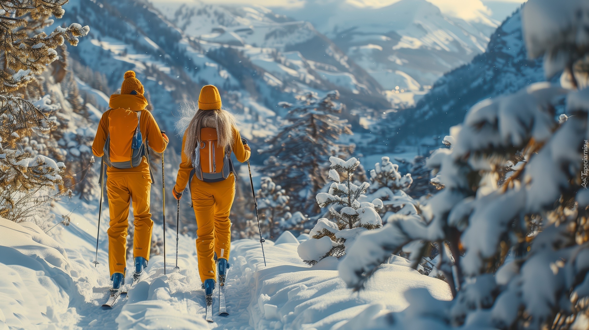 Edytor tapety: Narciarze obok ośnieżonych drzew w górach